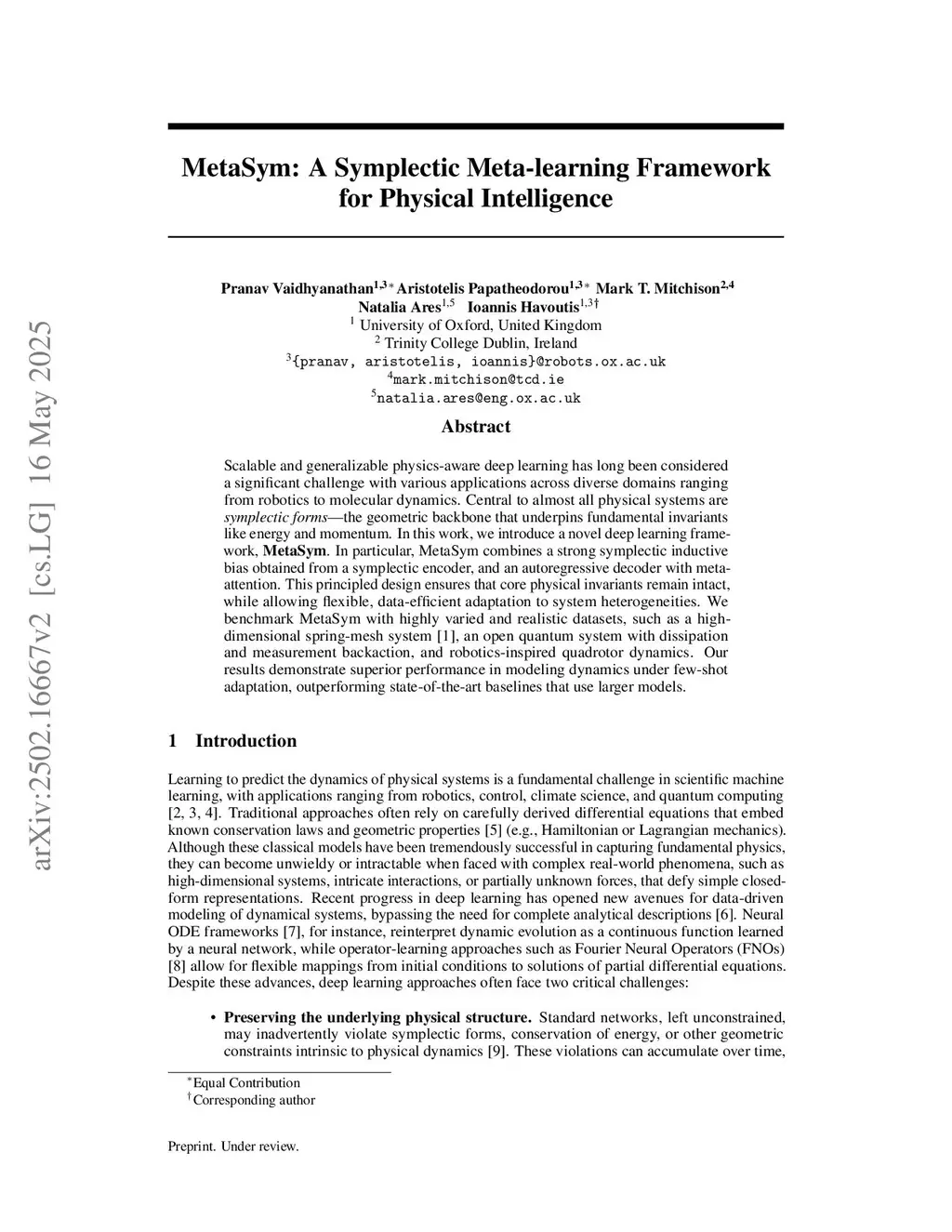 Scalable and generalizable physics-aware deep learning has long been considered a significant challenge with various applications across diverse domains ranging from robotics to molecular dynamics. Central to almost all physical systems are symplectic forms, the geometric backbone that underpins fundamental invariants like energy and momentum. In this work, we introduce a novel deep learning framework, MetaSym. In particular, MetaSym combines a strong symplectic inductive bias obtained from a symplectic encoder, and an autoregressive decoder with meta-attention. This principled design ensures that core physical invariants remain intact, while allowing flexible, data efficient adaptation to system heterogeneities. We benchmark MetaSym with highly varied and realistic datasets, such as a high-dimensional spring-mesh system Otness et al. (2021), an open quantum system with dissipation and measurement backaction, and robotics-inspired quadrotor dynamics. Crucially, we fine-tune and deploy MetaSym on real-world quadrotor data, demonstrating robustness to sensor noise and real-world uncertainty. Across all tasks, MetaSym achieves superior few-shot adaptation and outperforms larger state-of-the-art (SOTA) models.