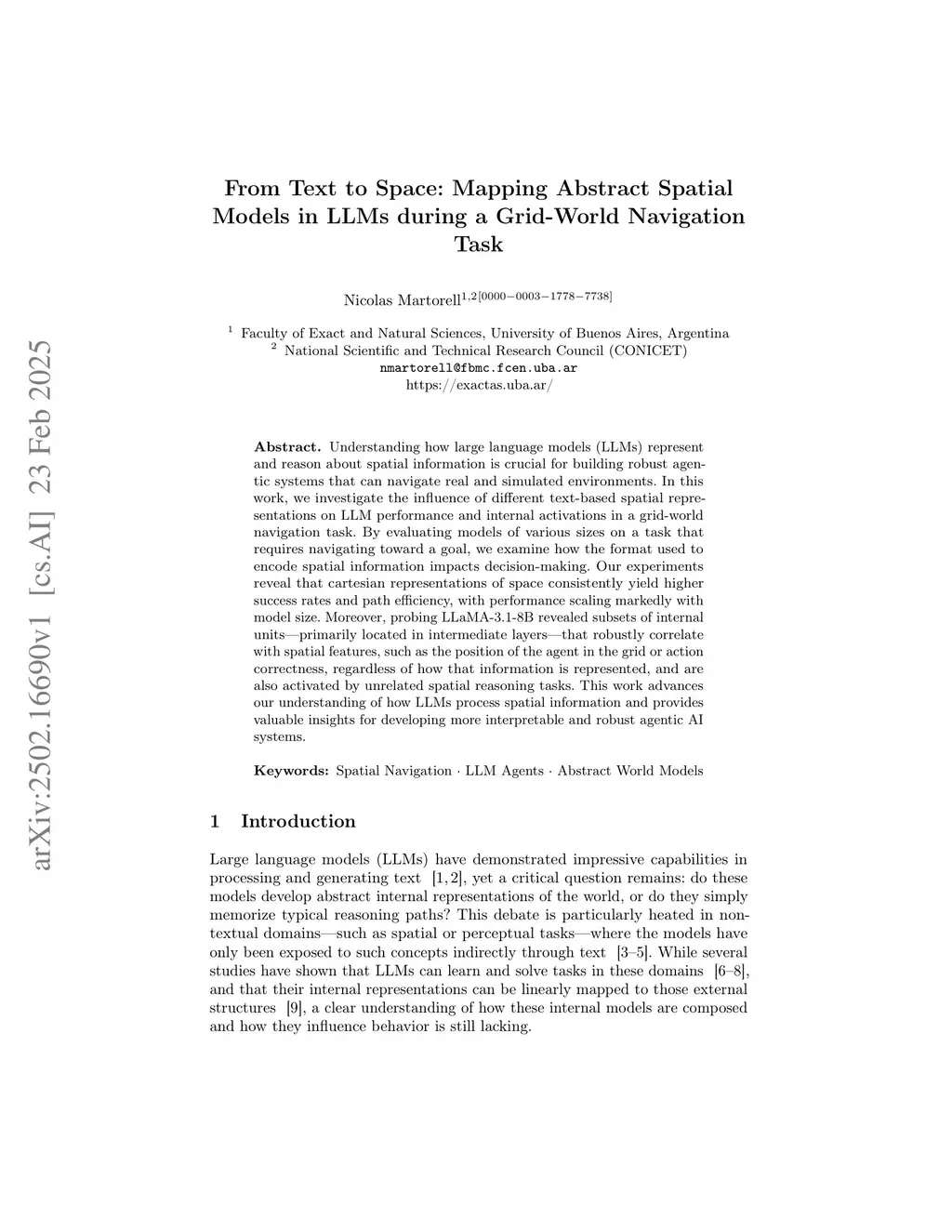 Understanding how large language models (LLMs) represent and reason about spatial information is crucial for building robust agentic systems that can navigate real and simulated environments. In this work, we investigate the influence of different text-based spatial representations on LLM performance and internal activations in a grid-world navigation task. By evaluating models of various sizes on a task that requires navigating toward a goal, we examine how the format used to encode spatial information impacts decision-making. Our experiments reveal that cartesian representations of space consistently yield higher success rates and path efficiency, with performance scaling markedly with model size. Moreover, probing LLaMA-3.1-8B revealed subsets of internal units, primarily located in intermediate layers, that robustly correlate with spatial features, such as the position of the agent in the grid or action correctness, regardless of how that information is represented, and are also activated by unrelated spatial reasoning tasks. This work advances our understanding of how LLMs process spatial information and provides valuable insights for developing more interpretable and robust agentic AI systems.