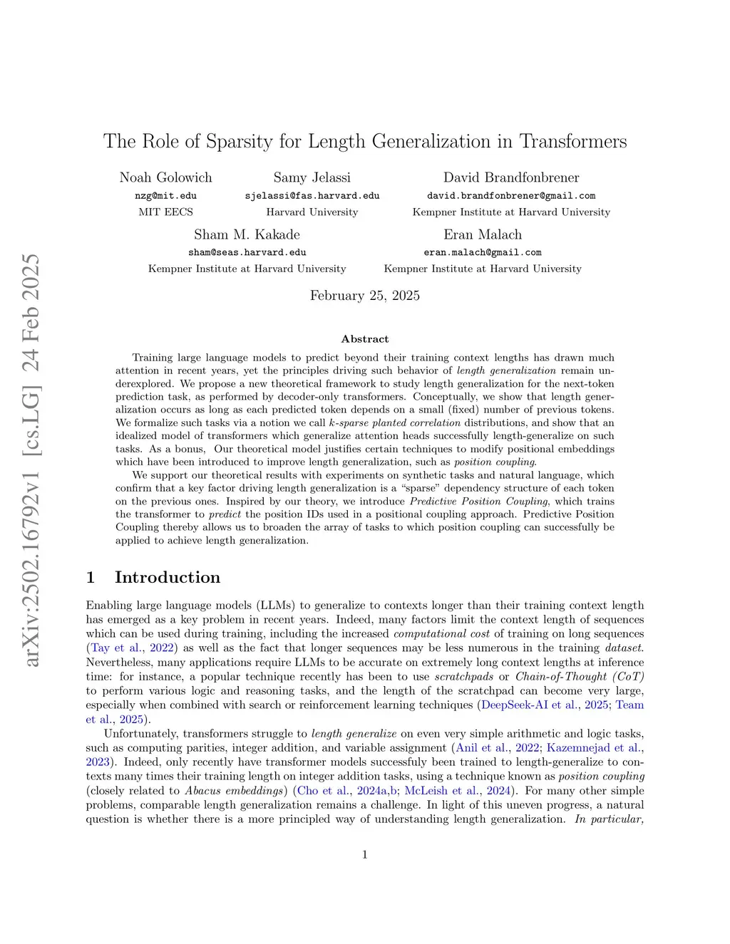 Training large language models to predict beyond their training context lengths has drawn much attention in recent years, yet the principles driving such behavior of length generalization remain underexplored. We propose a new theoretical framework to study length generalization for the next-token prediction task, as performed by decoder-only transformers. Conceptually, we show that length generalization occurs as long as each predicted token depends on a small (fixed) number of previous tokens. We formalize such tasks via a notion we call -sparse planted correlation distributions, and show that an idealized model of transformers which generalize attention heads successfully length-generalize on such tasks. As a bonus, our theoretical model justifies certain techniques to modify positional embeddings which have been introduced to improve length generalization, such as position coupling.We support our theoretical results with experiments on synthetic tasks and natural language, which confirm that a key factor driving length generalization is a ``sparse'' dependency structure of each token on the previous ones. Inspired by our theory, we introduce Predictive Position Coupling, which trains the transformer to predict the position IDs used in a positional coupling approach. Predictive Position Coupling thereby allows us to broaden the array of tasks to which position coupling can successfully be applied to achieve length generalization.