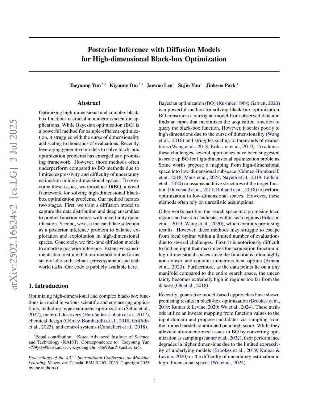 Optimizing high-dimensional and complex black-box functions is crucial in numerous scientific applications. While Bayesian optimization (BO) is a powerful method for sample-efficient optimization, it struggles with the curse of dimensionality and scaling to thousands of evaluations. Recently, leveraging generative models to solve black-box optimization problems has emerged as a promising framework. However, those methods often underperform compared to BO methods due to limited expressivity and difficulty of uncertainty estimation in high-dimensional spaces. To overcome these issues, we introduce \textbf{DiBO}, a novel framework for solving high-dimensional black-box optimization problems. Our method iterates two stages. First, we train a diffusion model to capture the data distribution and deep ensembles to predict function values with uncertainty quantification. Second, we cast the candidate selection as a posterior inference problem to balance exploration and exploitation in high-dimensional spaces. Concretely, we fine-tune diffusion models to amortize posterior inference. Extensive experiments demonstrate that our method outperforms state-of-the-art baselines across synthetic and real-world tasks. Our code is publicly available \href{this https URL}{here}.