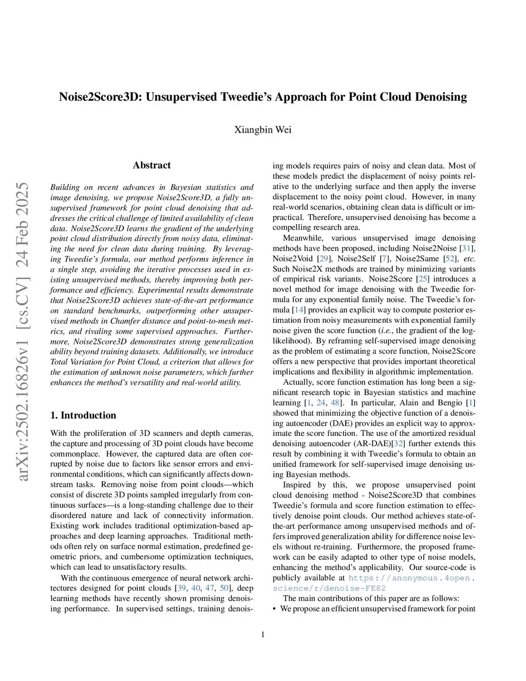 Building on recent advances in Bayesian statistics and image denoising, we propose Noise2Score3D, a fully unsupervised framework for point cloud denoising that addresses the critical challenge of limited availability of clean data. Noise2Score3D learns the gradient of the underlying point cloud distribution directly from noisy data, eliminating the need for clean data during training. By leveraging Tweedie's formula, our method performs inference in a single step, avoiding the iterative processes used in existing unsupervised methods, thereby improving both performance and efficiency. Experimental results demonstrate that Noise2Score3D achieves state-of-the-art performance on standard benchmarks, outperforming other unsupervised methods in Chamfer distance and point-to-mesh metrics, and rivaling some supervised approaches. Furthermore, Noise2Score3D demonstrates strong generalization ability beyond training datasets. Additionally, we introduce Total Variation for Point Cloud, a criterion that allows for the estimation of unknown noise parameters, which further enhances the method's versatility and real-world utility.