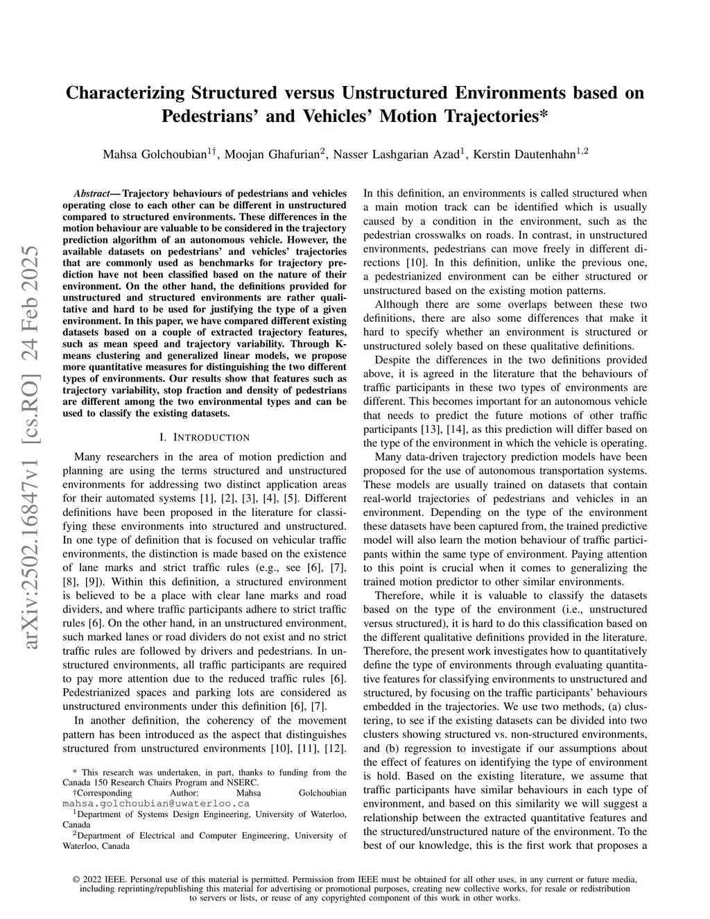 Characterizing Structured versus Unstructured Environments based on Pedestrians' and Vehicles' Motion Trajectories