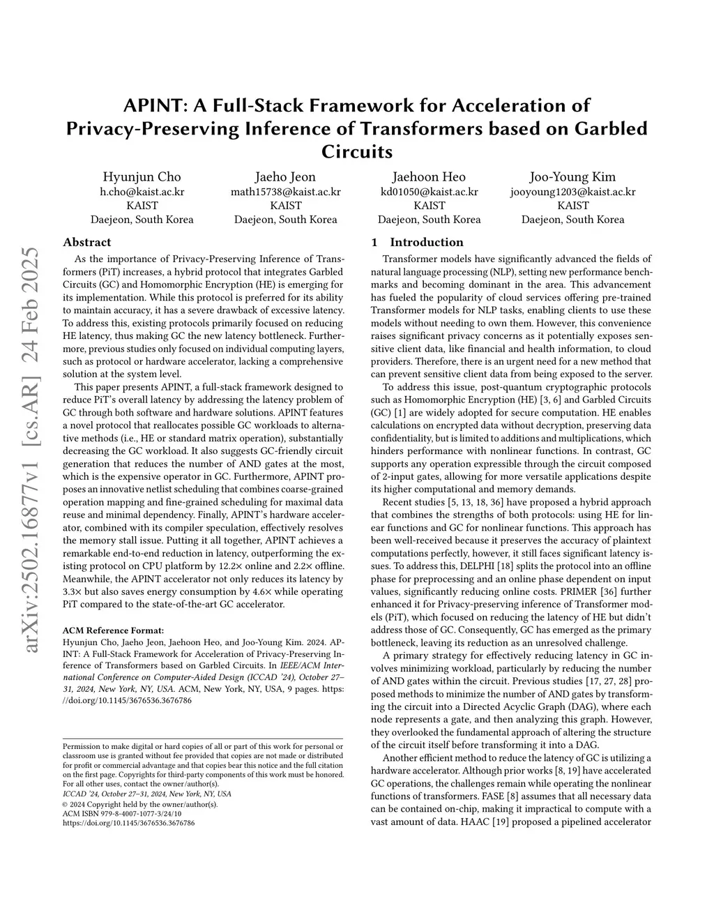 As the importance of Privacy-Preserving Inference of Transformers (PiT) increases, a hybrid protocol that integrates Garbled Circuits (GC) and Homomorphic Encryption (HE) is emerging for its implementation. While this protocol is preferred for its ability to maintain accuracy, it has a severe drawback of excessive latency. To address this, existing protocols primarily focused on reducing HE latency, thus making GC the new latency bottleneck. Furthermore, previous studies only focused on individual computing layers, such as protocol or hardware accelerator, lacking a comprehensive solution at the system level. This paper presents APINT, a full-stack framework designed to reduce PiT's overall latency by addressing the latency problem of GC through both software and hardware solutions. APINT features a novel protocol that reallocates possible GC workloads to alternative methods (i.e., HE or standard matrix operation), substantially decreasing the GC workload. It also suggests GC-friendly circuit generation that reduces the number of AND gates at the most, which is the expensive operator in GC. Furthermore, APINT proposes an innovative netlist scheduling that combines coarse-grained operation mapping and fine-grained scheduling for maximal data reuse and minimal dependency. Finally, APINT's hardware accelerator, combined with its compiler speculation, effectively resolves the memory stall issue. Putting it all together, APINT achieves a remarkable end-to-end reduction in latency, outperforming the existing protocol on CPU platform by 12.2x online and 2.2x offline. Meanwhile, the APINT accelerator not only reduces its latency by 3.3x but also saves energy consumption by 4.6x while operating PiT compared to the state-of-the-art GC accelerator.