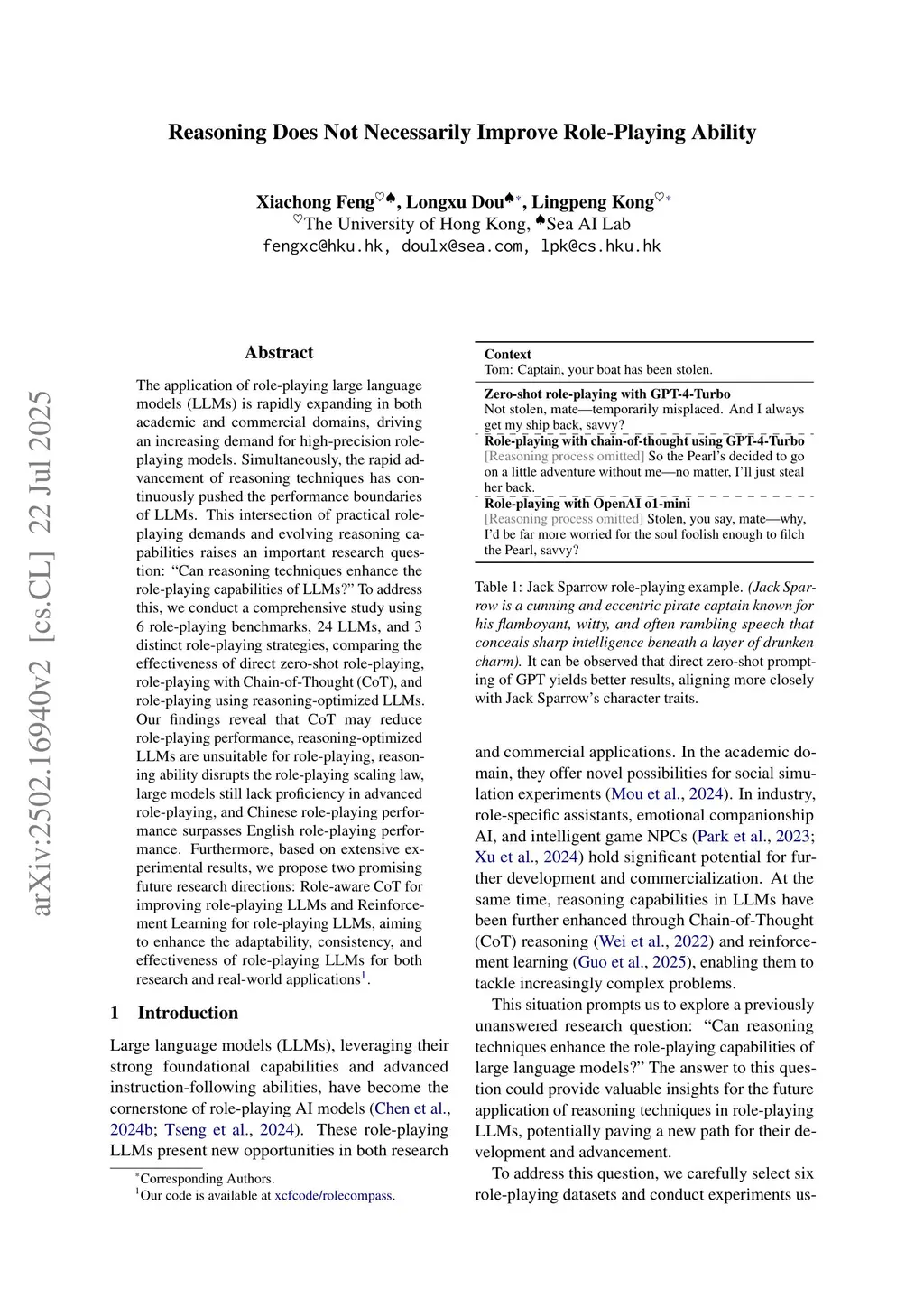 The application of role-playing large language models (LLMs) is rapidly expanding in both academic and commercial domains, driving an increasing demand for high-precision role-playing models. Simultaneously, the rapid advancement of reasoning techniques has continuously pushed the performance boundaries of LLMs. This intersection of practical role-playing demands and evolving reasoning capabilities raises an important research question: "Can reasoning techniques enhance the role-playing capabilities of LLMs?" To address this, we conduct a comprehensive study using 6 role-playing benchmarks, 24 LLMs, and 3 distinct role-playing strategies, comparing the effectiveness of direct zero-shot role-playing, role-playing with Chain-of-Thought (CoT), and role-playing using reasoning-optimized LLMs. Our findings reveal that CoT may reduce role-playing performance, reasoning-optimized LLMs are unsuitable for role-playing, reasoning ability disrupts the role-playing scaling law, large models still lack proficiency in advanced role-playing, and Chinese role-playing performance surpasses English role-playing performance. Furthermore, based on extensive experimental results, we propose two promising future research directions: Role-aware CoT for improving role-playing LLMs and Reinforcement Learning for role-playing LLMs, aiming to enhance the adaptability, consistency, and effectiveness of role-playing LLMs for both research and real-world applications.