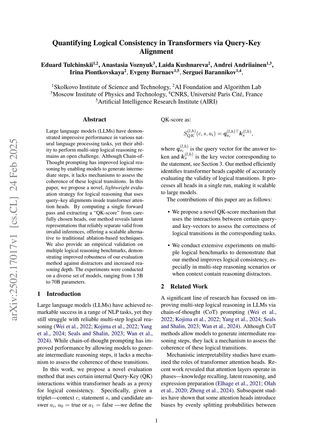 Large language models (LLMs) have demonstrated impressive performance in various natural language processing tasks, yet their ability to perform multi-step logical reasoning remains an open challenge. Although Chain-of-Thought prompting has improved logical reasoning by enabling models to generate intermediate steps, it lacks mechanisms to assess the coherence of these logical transitions. In this paper, we propose a novel, lightweight evaluation strategy for logical reasoning that uses query-key alignments inside transformer attention heads. By computing a single forward pass and extracting a "QK-score" from carefully chosen heads, our method reveals latent representations that reliably separate valid from invalid inferences, offering a scalable alternative to traditional ablation-based techniques. We also provide an empirical validation on multiple logical reasoning benchmarks, demonstrating improved robustness of our evaluation method against distractors and increased reasoning depth. The experiments were conducted on a diverse set of models, ranging from 1.5B to 70B parameters.