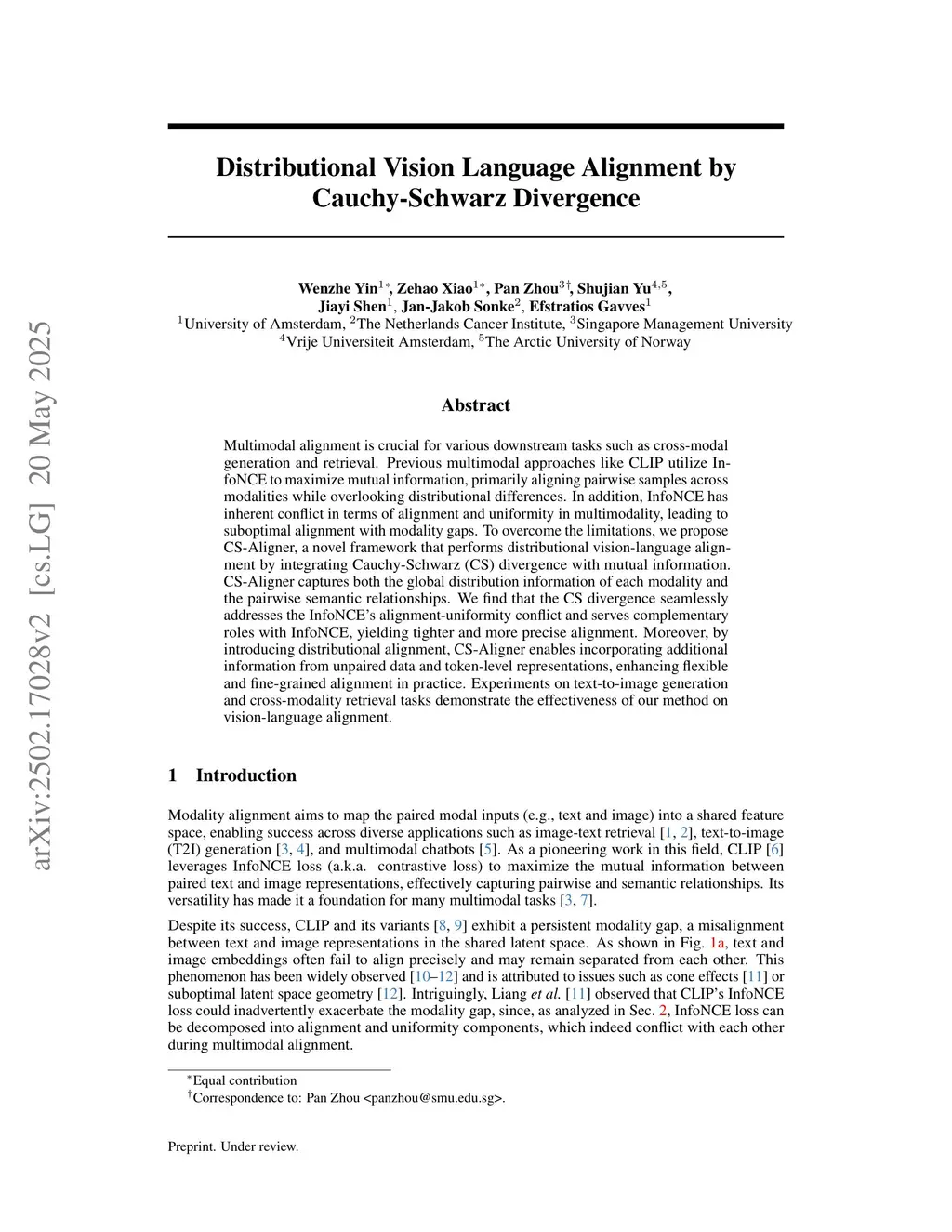 Vision-language alignment is crucial for various downstream tasks such as cross-modal generation and retrieval. Previous multimodal approaches like CLIP utilize InfoNCE to maximize mutual information, primarily aligning pairwise samples across modalities while overlooking distributional differences. In addition, InfoNCE has inherent conflict in terms of alignment and uniformity in multimodality, leading to suboptimal alignment with modality gaps. To overcome the limitations, we propose CS-Aligner, a novel framework that performs distributional vision-language alignment by integrating Cauchy-Schwarz (CS) divergence with mutual information. CS-Aligner captures both the global distribution information of each modality and the pairwise semantic relationships. We find that the CS divergence seamlessly addresses the InfoNCE's alignment-uniformity conflict and serves complementary roles with InfoNCE, yielding tighter and more precise alignment. Moreover, by introducing distributional alignment, CS-Aligner enables incorporating additional information from unpaired data and token-level representations, enhancing flexible and fine-grained alignment in practice. Experiments on text-to-image generation and cross-modality retrieval tasks demonstrate the effectiveness of our method on vision-language alignment.