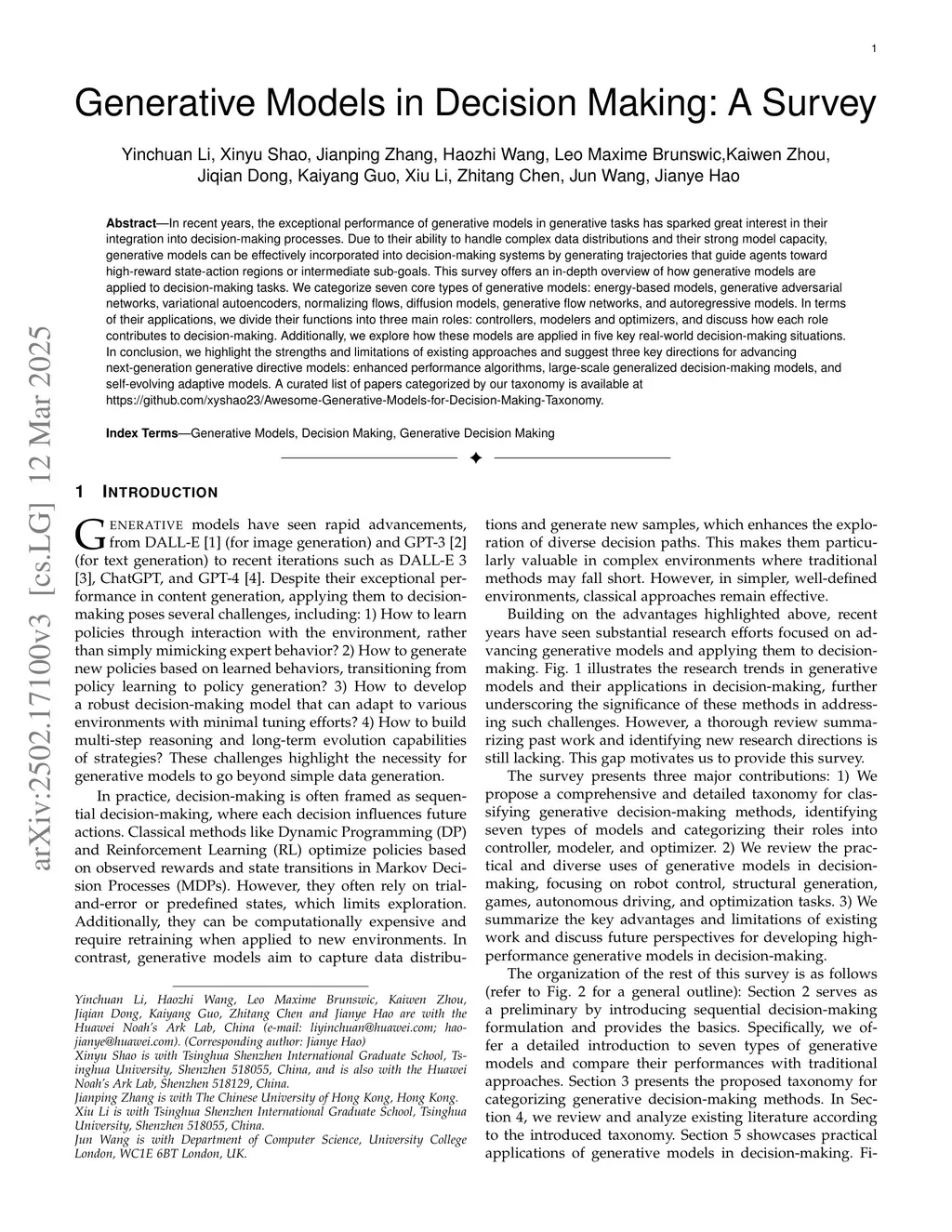 Generative models have fundamentally reshaped the landscape of decision-making, reframing the problem from pure scalar reward maximization to high-fidelity trajectory generation and distribution matching. This paradigm shift addresses intrinsic limitations in classical Reinforcement Learning (RL), particularly the limited expressivity of standard unimodal policy distributions in capturing complex, multi-modal behaviors embedded in diverse datasets. However, current literature often treats these models as isolated algorithmic improvements, rarely synthesizing them into a single comprehensive framework. This survey proposes a principled taxonomy grounding generative decision-making within the probabilistic framework of Control as Inference. By performing a variational factorization of the trajectory posterior, we conceptualize four distinct functional roles: Controllers for amortized policy inference, Modelers for dynamics priors, Optimizers for iterative trajectory refinement, and Evaluators for trajectory guidance and value assessment. Unlike existing architecture-centric reviews, this function-centric framework allows us to critically analyze representative generative families across distinct dimensions. Furthermore, we examine deployment in high-stakes domains, specifically Embodied AI, Autonomous Driving, and AI for Science, highlighting systemic risks such as dynamics hallucination in world models and proxy exploitation. Finally, we chart the path toward Generalist Physical Intelligence, identifying pivotal challenges in inference efficiency, trustworthiness, and the emergence of Physical Foundation Models.