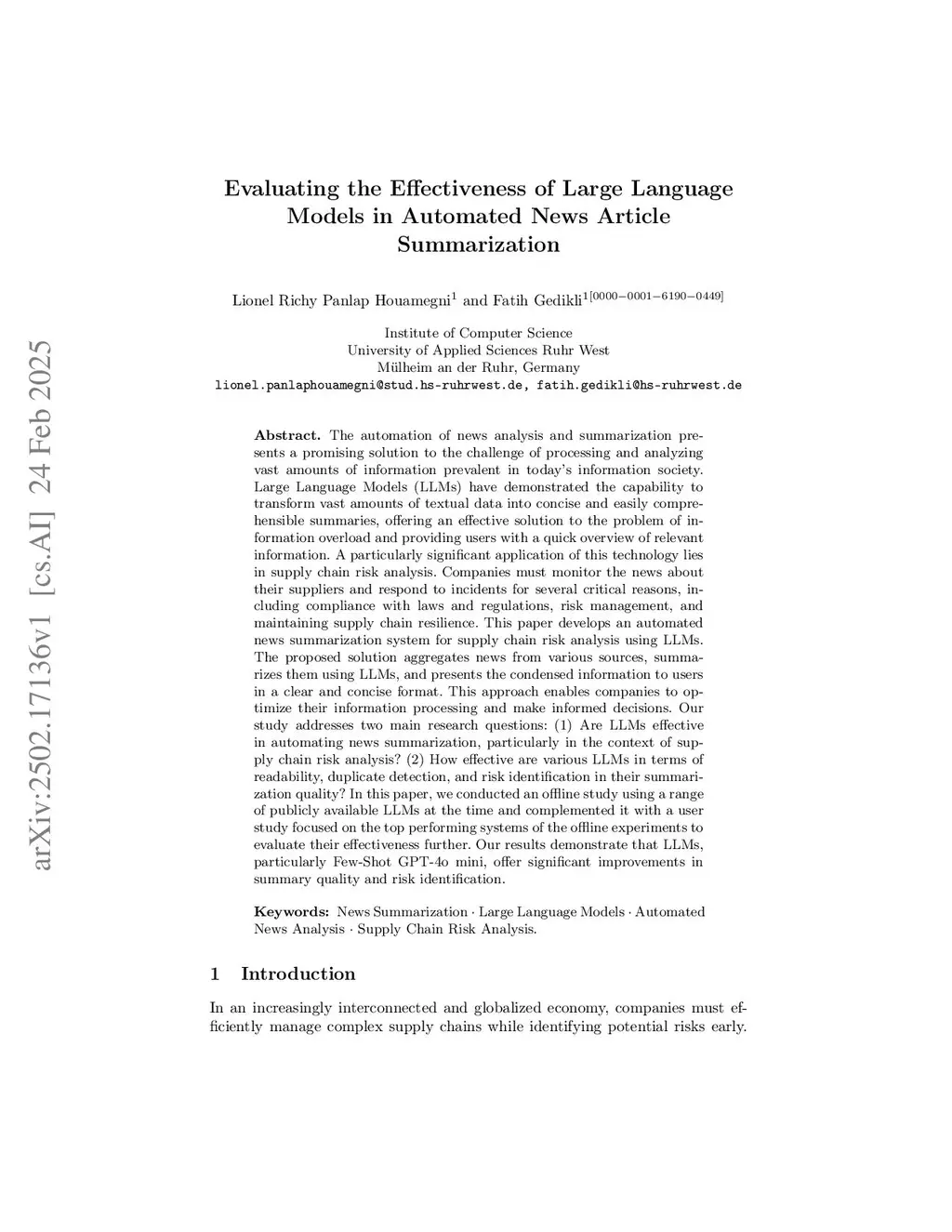 The automation of news analysis and summarization presents a promising solution to the challenge of processing and analyzing vast amounts of information prevalent in today's information society. Large Language Models (LLMs) have demonstrated the capability to transform vast amounts of textual data into concise and easily comprehensible summaries, offering an effective solution to the problem of information overload and providing users with a quick overview of relevant information. A particularly significant application of this technology lies in supply chain risk analysis. Companies must monitor the news about their suppliers and respond to incidents for several critical reasons, including compliance with laws and regulations, risk management, and maintaining supply chain resilience. This paper develops an automated news summarization system for supply chain risk analysis using LLMs. The proposed solution aggregates news from various sources, summarizes them using LLMs, and presents the condensed information to users in a clear and concise format. This approach enables companies to optimize their information processing and make informed decisions. Our study addresses two main research questions: (1) Are LLMs effective in automating news summarization, particularly in the context of supply chain risk analysis? (2) How effective are various LLMs in terms of readability, duplicate detection, and risk identification in their summarization quality? In this paper, we conducted an offline study using a range of publicly available LLMs at the time and complemented it with a user study focused on the top performing systems of the offline experiments to evaluate their effectiveness further. Our results demonstrate that LLMs, particularly Few-Shot GPT-4o mini, offer significant improvements in summary quality and risk identification.