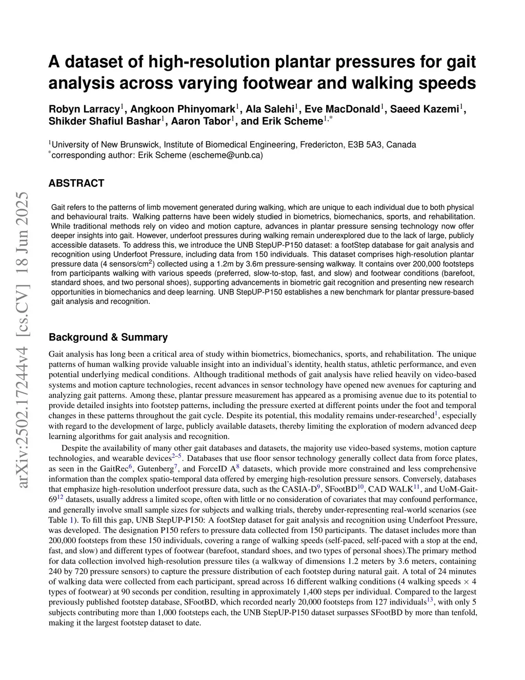 Gait refers to the patterns of limb movement generated during walking, which are unique to each individual due to both physical and behavioral traits. Walking patterns have been widely studied in biometrics, biomechanics, sports, and rehabilitation. While traditional methods rely on video and motion capture, advances in plantar pressure sensing technology now offer deeper insights into gait. However, underfoot pressures during walking remain underexplored due to the lack of large, publicly accessible datasets. To address this, we introduce the UNB StepUP-P150 dataset: a footStep database for gait analysis and recognition using Underfoot Pressure, including data from 150 individuals. This dataset comprises high-resolution plantar pressure data (4 sensors per cm-squared) collected using a 1.2m by 3.6m pressure-sensing walkway. It contains over 200,000 footsteps from participants walking with various speeds (preferred, slow-to-stop, fast, and slow) and footwear conditions (barefoot, standard shoes, and two personal shoes), supporting advancements in biometric gait recognition and presenting new research opportunities in biomechanics and deep learning. UNB StepUP-P150 establishes a new benchmark for plantar pressure-based gait analysis and recognition.
