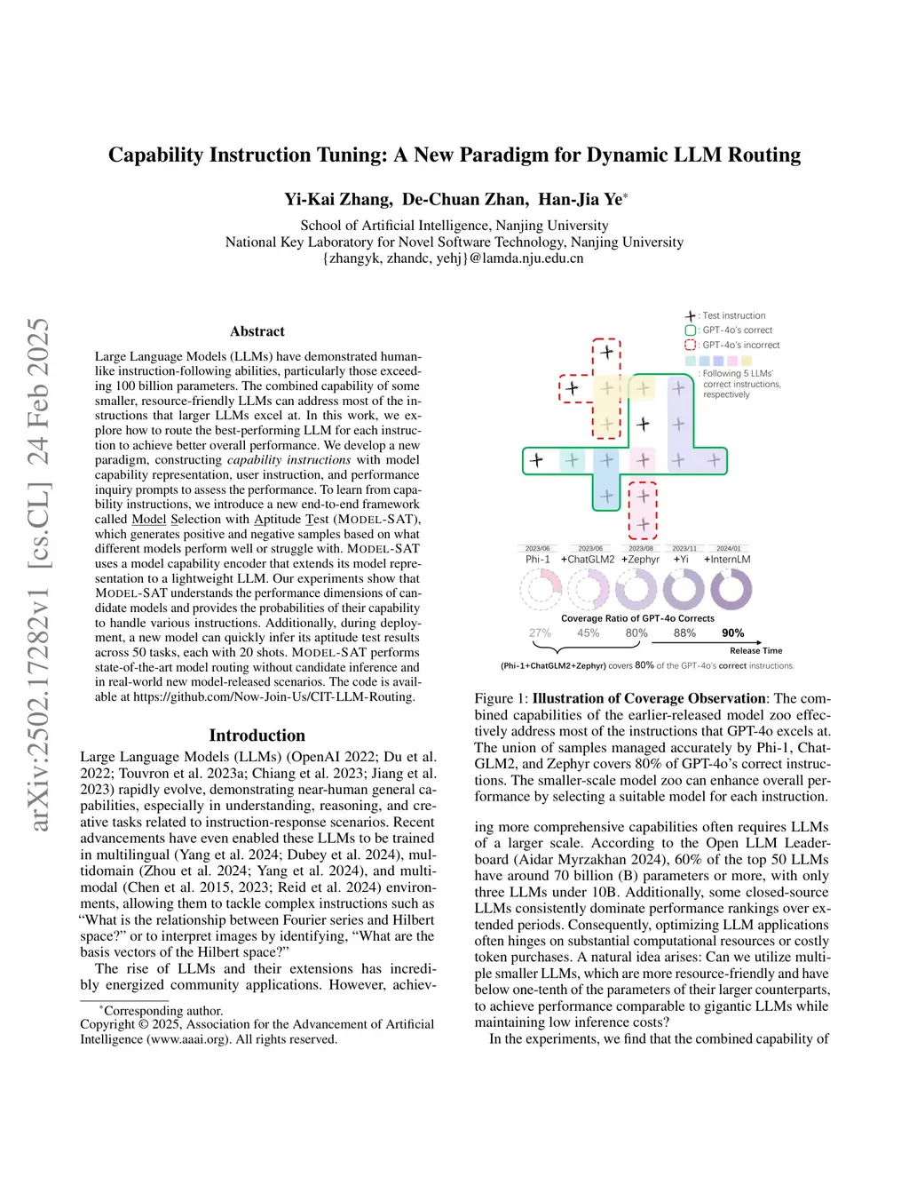 Large Language Models (LLMs) have demonstrated human-like instruction-following abilities, particularly those exceeding 100 billion parameters. The combined capability of some smaller, resource-friendly LLMs can address most of the instructions that larger LLMs excel at. In this work, we explore how to route the best-performing LLM for each instruction to achieve better overall performance. We develop a new paradigm, constructing capability instructions with model capability representation, user instruction, and performance inquiry prompts to assess the performance. To learn from capability instructions, we introduce a new end-to-end framework called Model Selection with Aptitude Test (Model-SAT), which generates positive and negative samples based on what different models perform well or struggle with. Model-SAT uses a model capability encoder that extends its model representation to a lightweight LLM. Our experiments show that Model-SAT understands the performance dimensions of candidate models and provides the probabilities of their capability to handle various instructions. Additionally, during deployment, a new model can quickly infer its aptitude test results across 50 tasks, each with 20 shots. Model-SAT performs state-of-the-art model routing without candidate inference and in real-world new model-released scenarios. The code is available atthis https URL