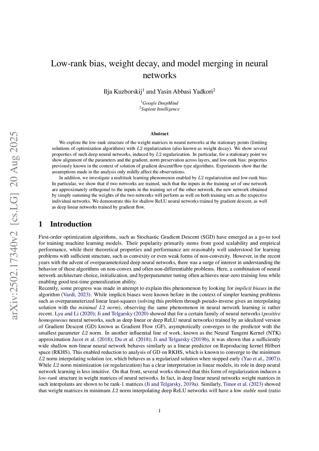 Low-rank bias, weight decay, and model merging in neural networks