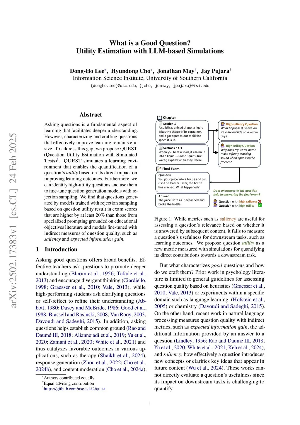Asking good questions is critical for comprehension and learning, yet evaluating and generating such questions remains a challenging problem. Prior work on inquisitive questions focuses on learner-generated, curiosity-driven queries and evaluates them using indirect metrics, such as salience or information gain, that do not directly capture a question's impact on actual learning outcomes. We introduce QUEST (Question Utility Estimation with Simulated Tests), a framework that uses language models to simulate learners and directly quantify the utility of a question - its contribution to exam performance. QUEST simulates a learner who asks questions and receives answers while studying a textbook chapter, then uses them to take an end-of-chapter exam. Through this simulation, the utility of each question is estimated by its direct effect on exam performance, rather than inferred indirectly based on the underlying content. To support this evaluation, we curate TEXTBOOK-EXAM, a benchmark that aligns textbook sections with end-of-section exam questions across five academic disciplines. Using QUEST, we filter for high-utility questions and fine-tune question generators via rejection sampling. Experiments show that questions generated by QUEST-trained models improve simulated test scores by over 20% compared to strong baselines that are fine-tuned using indirect metrics or leverage prompting methods. Furthermore, utility is only weakly correlated with salience and similarity to exam questions, suggesting that it captures unique signal that benefits downstream performance. QUEST offers a new outcome-driven paradigm for question evaluation and generation - one that moves beyond question-answer content toward measurable improvements in learning outcomes.