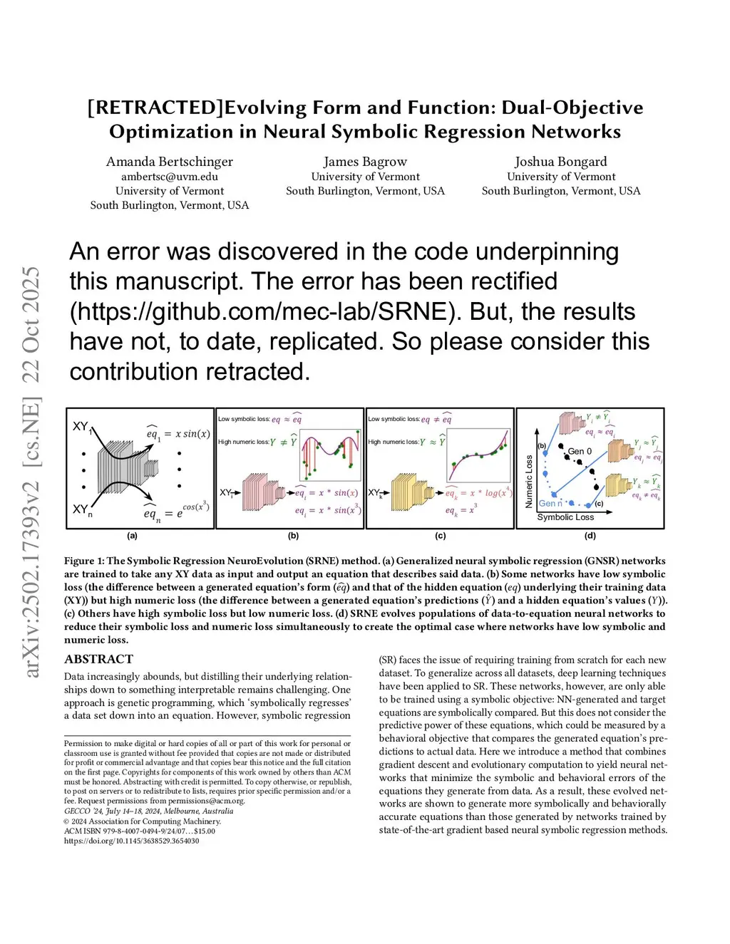 [RETRACTED]Evolving Form and Function: Dual-Objective Optimization in Neural Symbolic Regression Networks