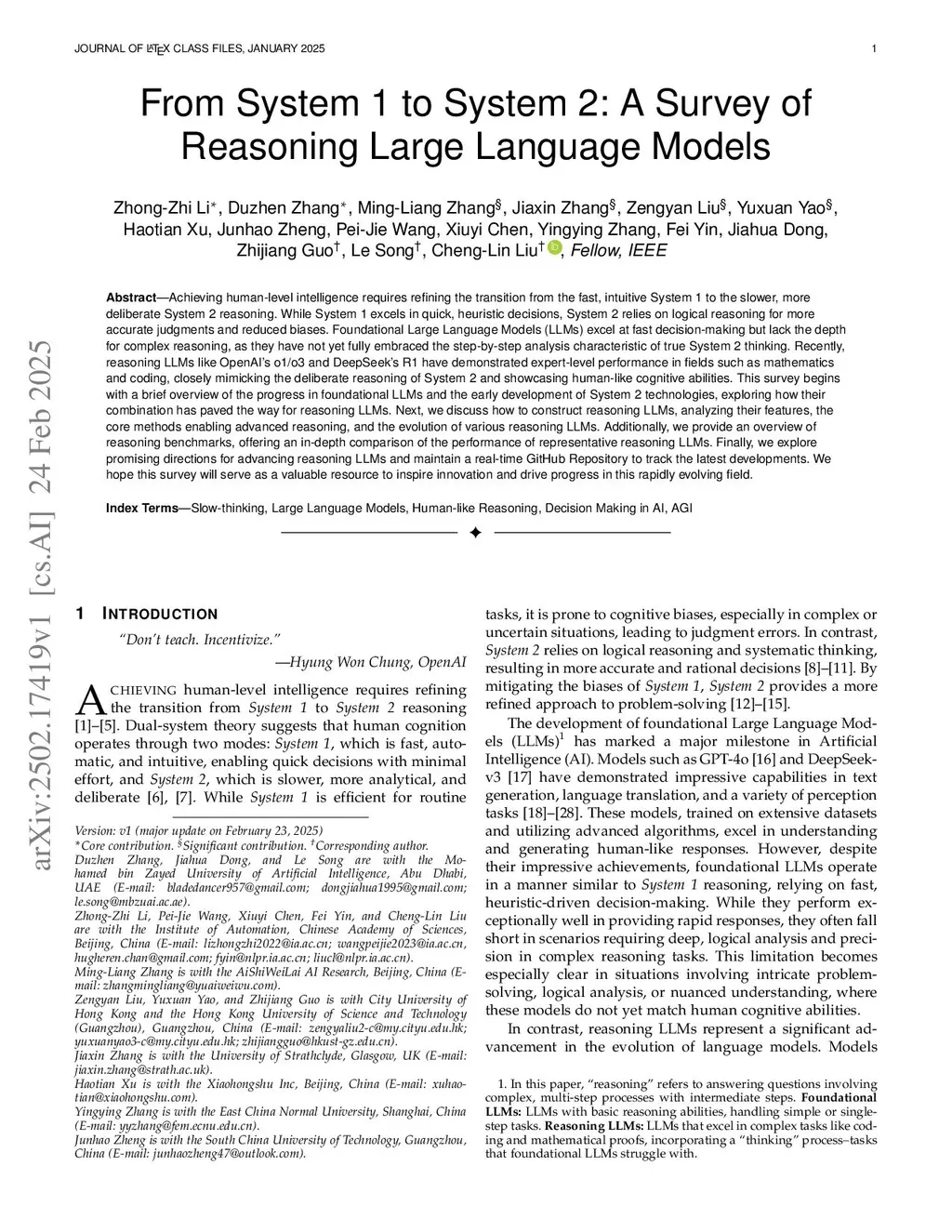 Achieving human-level intelligence requires refining the transition from the fast, intuitive System 1 to the slower, more deliberate System 2 reasoning. While System 1 excels in quick, heuristic decisions, System 2 relies on logical reasoning for more accurate judgments and reduced biases. Foundational Large Language Models (LLMs) excel at fast decision-making but lack the depth for complex reasoning, as they have not yet fully embraced the step-by-step analysis characteristic of true System 2 thinking. Recently, reasoning LLMs like OpenAI's o1/o3 and DeepSeek's R1 have demonstrated expert-level performance in fields such as mathematics and coding, closely mimicking the deliberate reasoning of System 2 and showcasing human-like cognitive abilities. This survey begins with a brief overview of the progress in foundational LLMs and the early development of System 2 technologies, exploring how their combination has paved the way for reasoning LLMs. Next, we discuss how to construct reasoning LLMs, analyzing their features, the core methods enabling advanced reasoning, and the evolution of various reasoning LLMs. Additionally, we provide an overview of reasoning benchmarks, offering an in-depth comparison of the performance of representative reasoning LLMs. Finally, we explore promising directions for advancing reasoning LLMs and maintain a real-time \href{this https URL}{GitHub Repository} to track the latest developments. We hope this survey will serve as a valuable resource to inspire innovation and drive progress in this rapidly evolving field.
