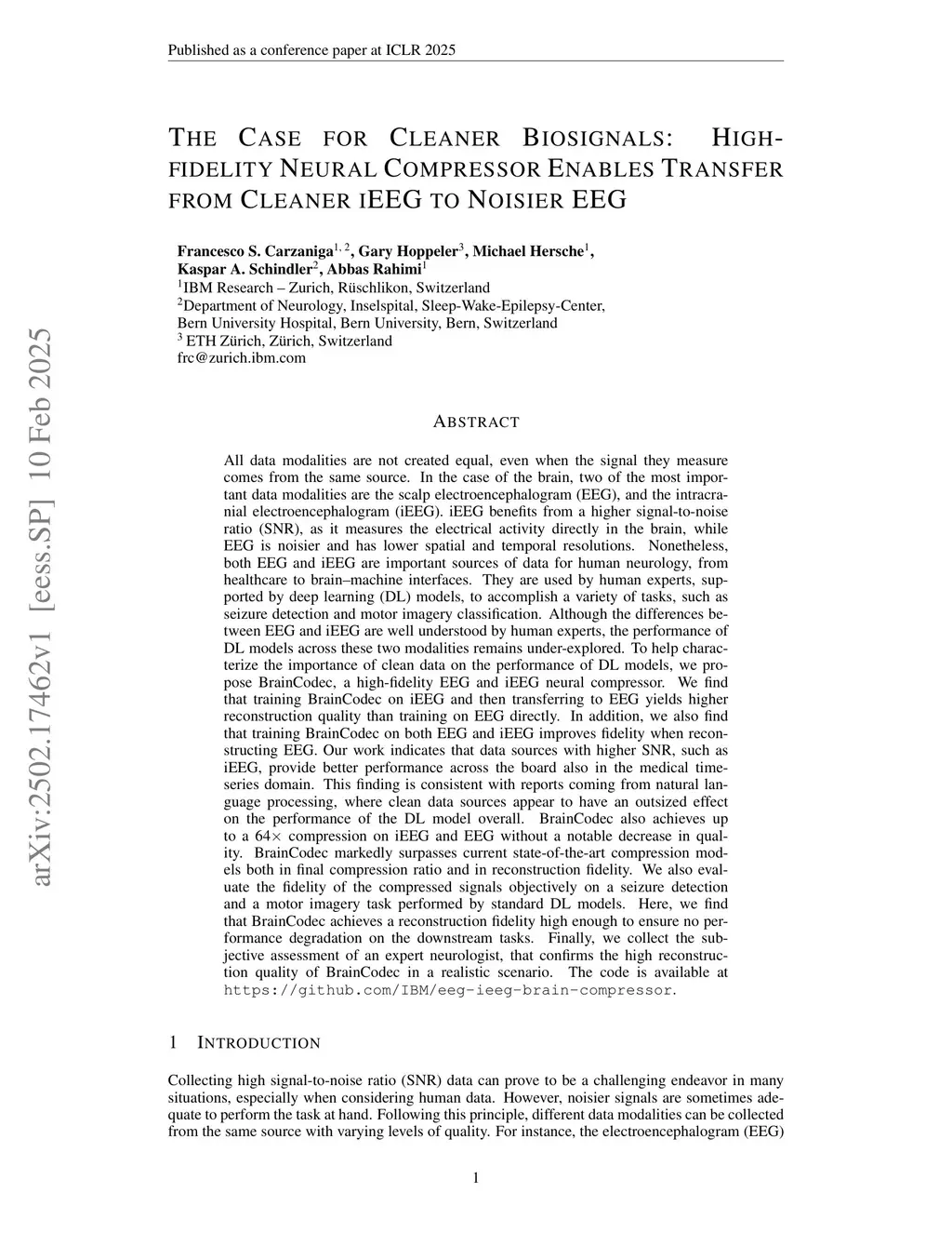 All data modalities are not created equal, even when the signal they measure comes from the same source. In the case of the brain, two of the most important data modalities are the scalp electroencephalogram (EEG), and the intracranial electroencephalogram (iEEG). They are used by human experts, supported by deep learning (DL) models, to accomplish a variety of tasks, such as seizure detection and motor imagery classification. Although the differences between EEG and iEEG are well understood by human experts, the performance of DL models across these two modalities remains under-explored. To help characterize the importance of clean data on the performance of DL models, we propose BrainCodec, a high-fidelity EEG and iEEG neural compressor. We find that training BrainCodec on iEEG and then transferring to EEG yields higher reconstruction quality than training on EEG directly. In addition, we also find that training BrainCodec on both EEG and iEEG improves fidelity when reconstructing EEG. Our work indicates that data sources with higher SNR, such as iEEG, provide better performance across the board also in the medical time-series domain. BrainCodec also achieves up to a 64x compression on iEEG and EEG without a notable decrease in quality. BrainCodec markedly surpasses current state-of-the-art compression models both in final compression ratio and in reconstruction fidelity. We also evaluate the fidelity of the compressed signals objectively on a seizure detection and a motor imagery task performed by standard DL models. Here, we find that BrainCodec achieves a reconstruction fidelity high enough to ensure no performance degradation on the downstream tasks. Finally, we collect the subjective assessment of an expert neurologist, that confirms the high reconstruction quality of BrainCodec in a realistic scenario. The code is available atthis https URL.