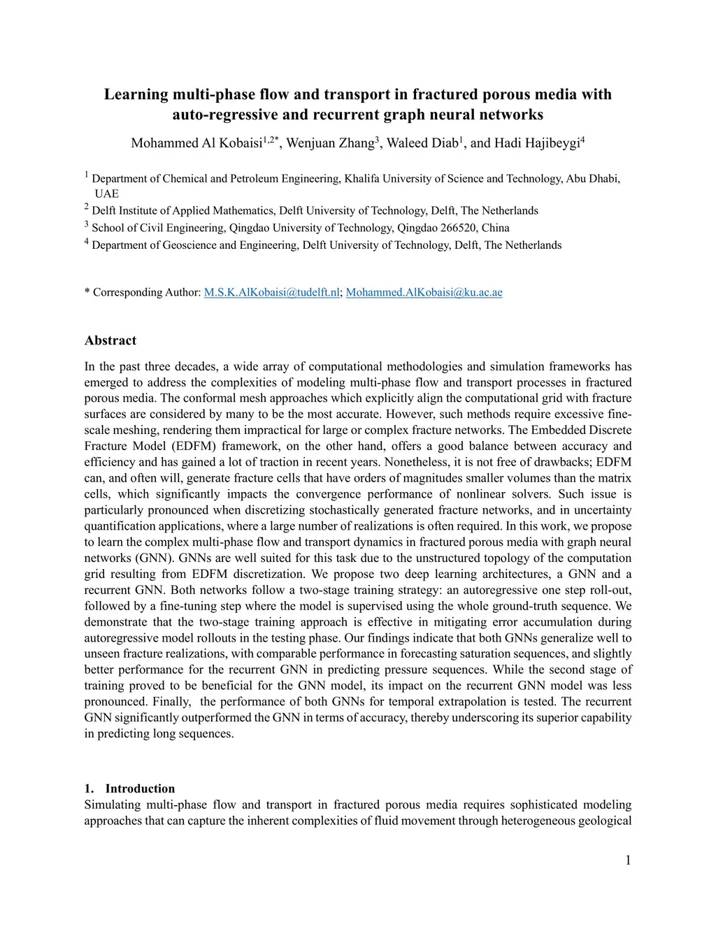 Learning multi-phase flow and transport in fractured porous media with auto-regressive and recurrent graph neural networks