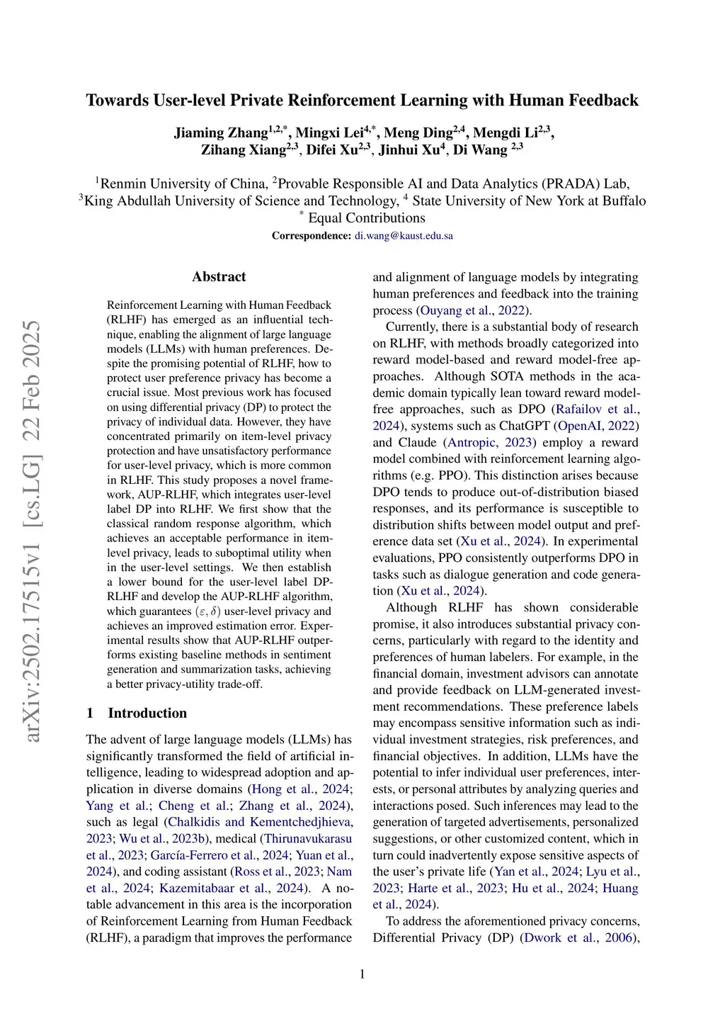 Reinforcement Learning with Human Feedback (RLHF) has emerged as an influential technique, enabling the alignment of large language models (LLMs) with human preferences. Despite the promising potential of RLHF, how to protect user preference privacy has become a crucial issue. Most previous work has focused on using differential privacy (DP) to protect the privacy of individual data. However, they have concentrated primarily on item-level privacy protection and have unsatisfactory performance for user-level privacy, which is more common in RLHF. This study proposes a novel framework, AUP-RLHF, which integrates user-level label DP into RLHF. We first show that the classical random response algorithm, which achieves an acceptable performance in item-level privacy, leads to suboptimal utility when in the user-level settings. We then establish a lower bound for the user-level label DP-RLHF and develop the AUP-RLHF algorithm, which guarantees user-level privacy and achieves an improved estimation error. Experimental results show that AUP-RLHF outperforms existing baseline methods in sentiment generation and summarization tasks, achieving a better privacy-utility trade-off.
