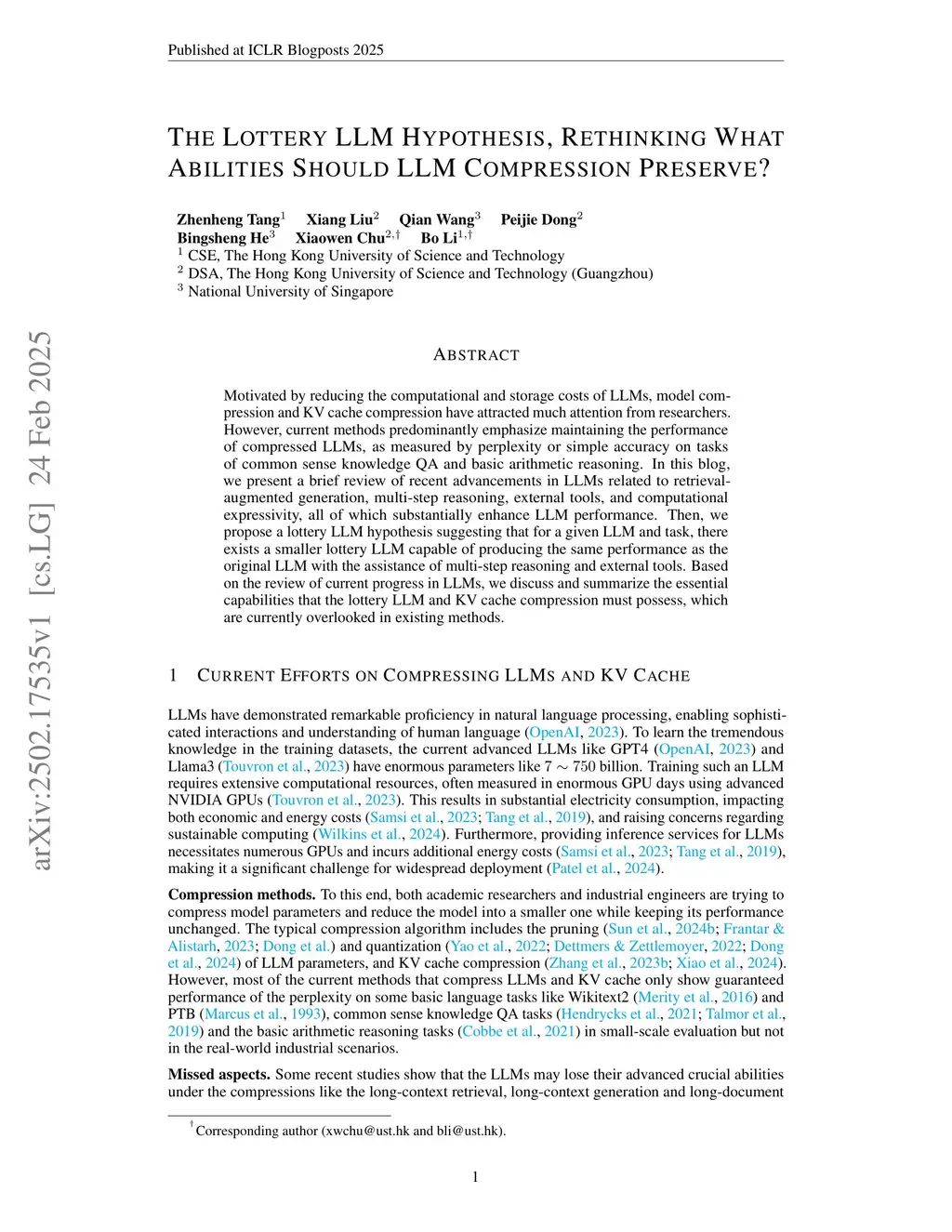 Motivated by reducing the computational and storage costs of LLMs, model compression and KV cache compression have attracted much attention from researchers. However, current methods predominantly emphasize maintaining the performance of compressed LLMs, as measured by perplexity or simple accuracy on tasks of common sense knowledge QA and basic arithmetic reasoning. In this blog, we present a brief review of recent advancements in LLMs related to retrieval-augmented generation, multi-step reasoning, external tools, and computational expressivity, all of which substantially enhance LLM performance. Then, we propose a lottery LLM hypothesis suggesting that for a given LLM and task, there exists a smaller lottery LLM capable of producing the same performance as the original LLM with the assistance of multi-step reasoning and external tools. Based on the review of current progress in LLMs, we discuss and summarize the essential capabilities that the lottery LLM and KV cache compression must possess, which are currently overlooked in existing methods.