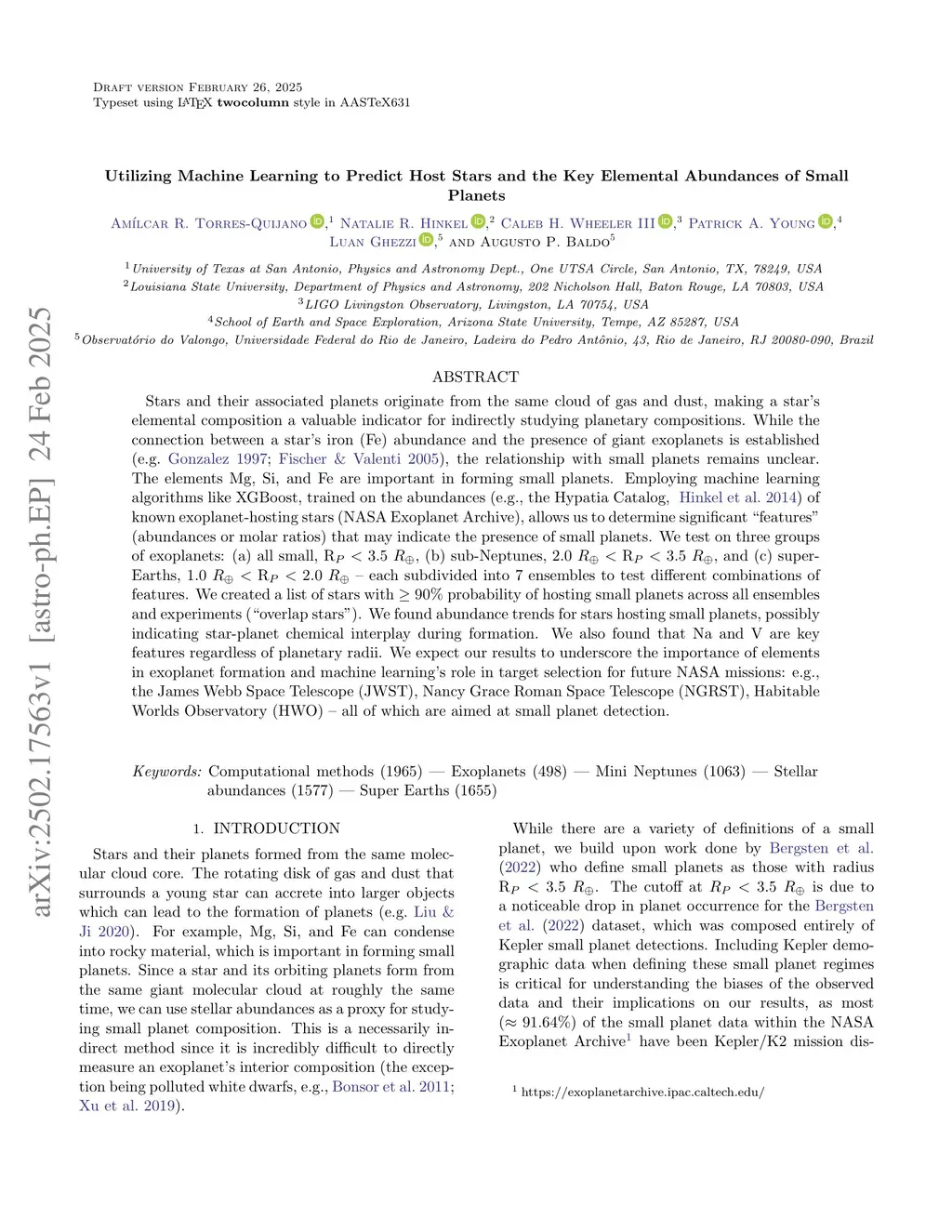 Stars and their associated planets originate from the same cloud of gas and dust, making a star's elemental composition a valuable indicator for indirectly studying planetary compositions. While the connection between a star's iron (Fe) abundance and the presence of giant exoplanets is established (e.g. Gonzalez 1997; Fischer & Valenti 2005), the relationship with small planets remains unclear. The elements Mg, Si, and Fe are important in forming small planets. Employing machine learning algorithms like XGBoost, trained on the abundances (e.g., the Hypatia Catalog, Hinkel et al. 2014) of known exoplanet-hosting stars (NASA Exoplanet Archive), allows us to determine significant "features" (abundances or molar ratios) that may indicate the presence of small planets. We test on three groups of exoplanets: (a) all small, R 3.5 , (b) sub-Neptunes, 2.0 R 3.5 , and (c) super-Earths, 1.0 R 2.0 -- each subdivided into 7 ensembles to test different combinations of features. We created a list of stars with probability of hosting small planets across all ensembles and experiments ("overlap stars"). We found abundance trends for stars hosting small planets, possibly indicating star-planet chemical interplay during formation. We also found that Na and V are key features regardless of planetary radii. We expect our results to underscore the importance of elements in exoplanet formation and machine learning's role in target selection for future NASA missions: e.g., the James Webb Space Telescope (JWST), Nancy Grace Roman Space Telescope (NGRST), Habitable Worlds Observatory (HWO) -- all of which are aimed at small planet detection.