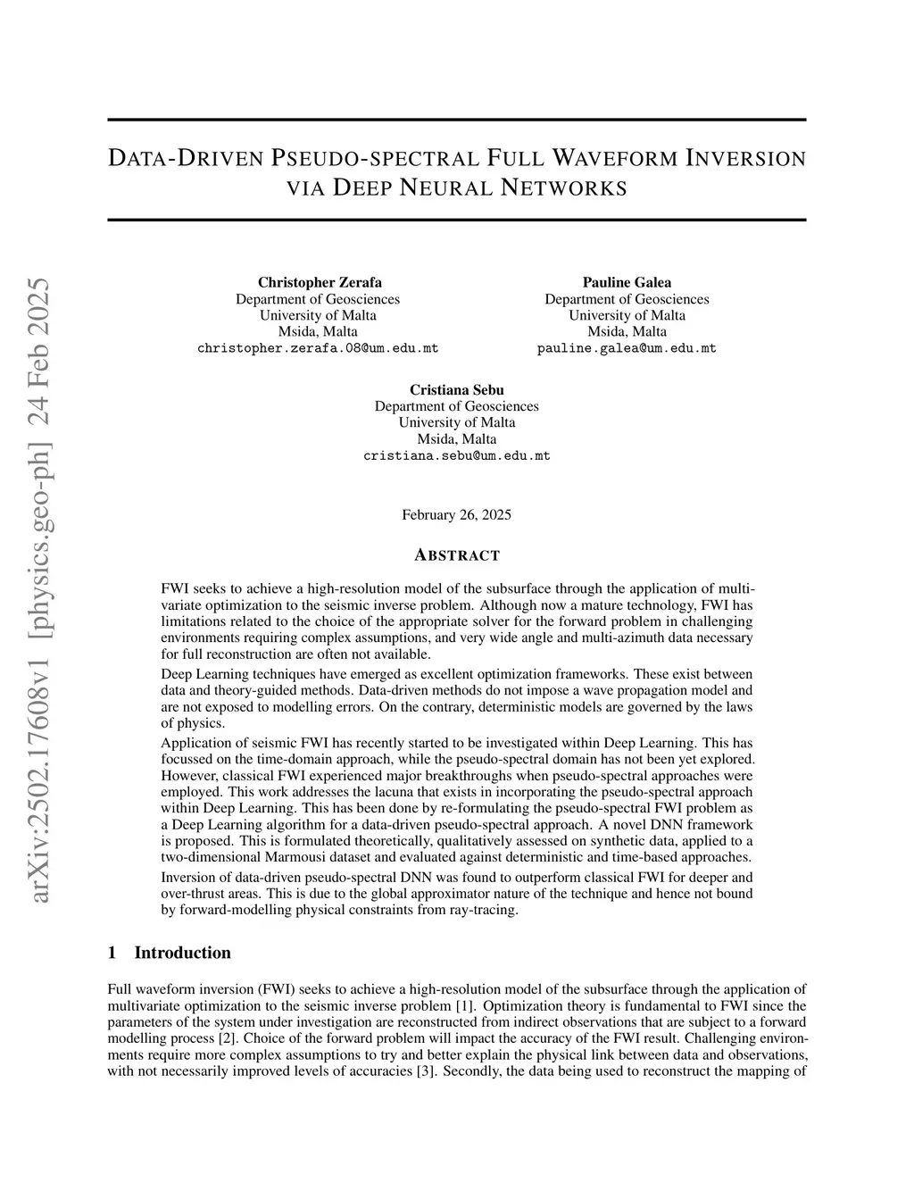 FWI seeks to achieve a high-resolution model of the subsurface through the application of multi-variate optimization to the seismic inverse problem. Although now a mature technology, FWI has limitations related to the choice of the appropriate solver for the forward problem in challenging environments requiring complex assumptions, and very wide angle and multi-azimuth data necessary for full reconstruction are often not available.Deep Learning techniques have emerged as excellent optimization frameworks. These exist between data and theory-guided methods. Data-driven methods do not impose a wave propagation model and are not exposed to modelling errors. On the contrary, deterministic models are governed by the laws of physics.Application of seismic FWI has recently started to be investigated within Deep Learning. This has focussed on the time-domain approach, while the pseudo-spectral domain has not been yet explored. However, classical FWI experienced major breakthroughs when pseudo-spectral approaches were employed. This work addresses the lacuna that exists in incorporating the pseudo-spectral approach within Deep Learning. This has been done by re-formulating the pseudo-spectral FWI problem as a Deep Learning algorithm for a data-driven pseudo-spectral approach. A novel DNN framework is proposed. This is formulated theoretically, qualitatively assessed on synthetic data, applied to a two-dimensional Marmousi dataset and evaluated against deterministic and time-based approaches.Inversion of data-driven pseudo-spectral DNN was found to outperform classical FWI for deeper and over-thrust areas. This is due to the global approximator nature of the technique and hence not bound by forward-modelling physical constraints from ray-tracing.