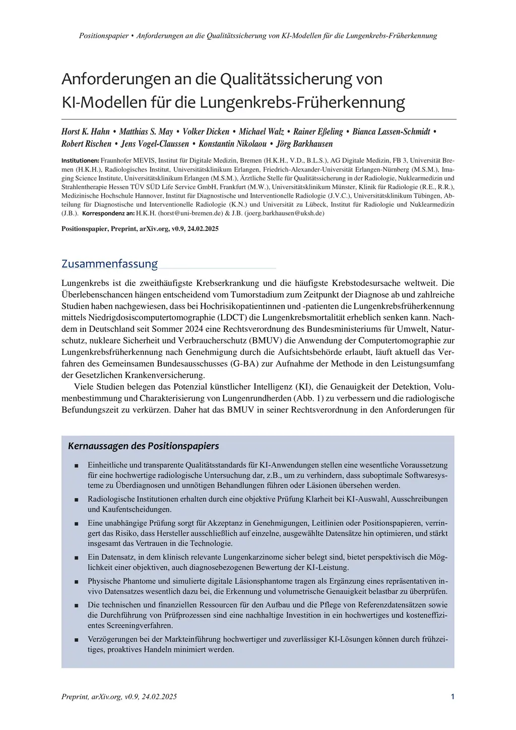 Lung cancer is the second most common cancer and the leading cause of cancer-related deaths worldwide. Survival largely depends on tumor stage at diagnosis, and early detection with low-dose CT can significantly reduce mortality in high-risk patients. AI can improve the detection, measurement, and characterization of pulmonary nodules while reducing assessment time. However, the training data, functionality, and performance of available AI systems vary considerably, complicating software selection and regulatory evaluation. Manufacturers must specify intended use and provide test statistics, but they can choose their training and test data, limiting standardization and comparability. Under the EU AI Act, consistent quality assurance is required for AI-based nodule detection, measurement, and characterization.This position paper proposes systematic quality assurance grounded in a validated reference dataset, including real screening cases plus phantom data to verify volume and growth rate measurements. Regular updates shall reflect demographic shifts and technological advances, ensuring ongoing relevance. Consequently, ongoing AI quality assurance is vital. Regulatory challenges are also adressed. While the MDR and the EU AI Act set baseline requirements, they do not adequately address self-learning algorithms or their updates. A standardized, transparent quality assessment - based on sensitivity, specificity, and volumetric accuracy - enables an objective evaluation of each AI solution's strengths and weaknesses. Establishing clear testing criteria and systematically using updated reference data lay the groundwork for comparable performance metrics, informing tenders, guidelines, and recommendations.