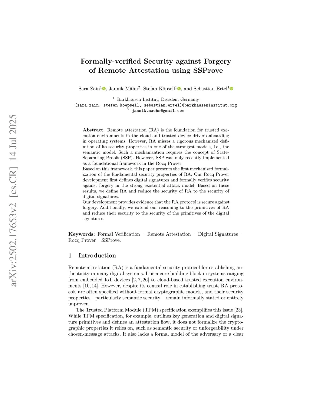 Remote attestation (RA) is the foundation for trusted execution environments in the cloud and trusted device driver onboarding in operating systems. However, RA misses a rigorous mechanized definition of its security properties in one of the strongest models, i.e., the semantic model. Such a mechanization requires the concept of StateSeparating Proofs (SSP). However, SSP was only recently implemented as a foundational framework in the Rocq Prover. Based on this framework, this paper presents the first mechanized formalization of the fundamental security properties of RA. Our Rocq Prover development first defines digital signatures and formally verifies security against forgery in the strong existential attack model. Based on these results, we define RA and reduce the security of RA to the security of digital signatures. Our development provides evidence that the RA protocol is secure against forgery. Additionally, we extend our reasoning to the primitives of RA and reduce their security to the security of the primitives of the digital signatures.