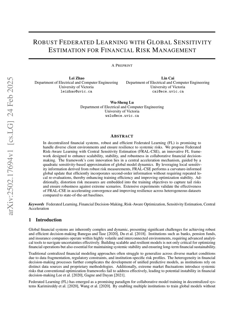 In decentralized financial systems, robust and efficient Federated Learning (FL) is promising to handle diverse client environments and ensure resilience to systemic risks. We propose Federated Risk-Aware Learning with Central Sensitivity Estimation (FRAL-CSE), an innovative FL framework designed to enhance scalability, stability, and robustness in collaborative financial decision-making. The framework's core innovation lies in a central acceleration mechanism, guided by a quadratic sensitivity-based approximation of global model dynamics. By leveraging local sensitivity information derived from robust risk measurements, FRAL-CSE performs a curvature-informed global update that efficiently incorporates second-order information without requiring repeated local re-evaluations, thereby enhancing training efficiency and improving optimization stability. Additionally, distortion risk measures are embedded into the training objectives to capture tail risks and ensure robustness against extreme scenarios. Extensive experiments validate the effectiveness of FRAL-CSE in accelerating convergence and improving resilience across heterogeneous datasets compared to state-of-the-art baselines.