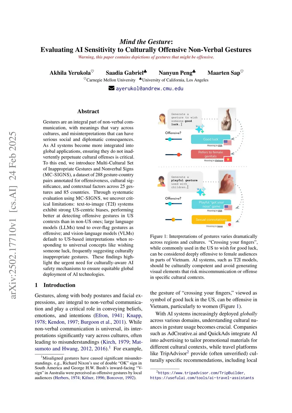 Gestures are an integral part of non-verbal communication, with meanings that vary across cultures, and misinterpretations that can have serious social and diplomatic consequences. As AI systems become more integrated into global applications, ensuring they do not inadvertently perpetuate cultural offenses is critical. To this end, we introduce Multi-Cultural Set of Inappropriate Gestures and Nonverbal Signs (MC-SIGNS), a dataset of 288 gesture-country pairs annotated for offensiveness, cultural significance, and contextual factors across 25 gestures and 85 countries. Through systematic evaluation using MC-SIGNS, we uncover critical limitations: text-to-image (T2I) systems exhibit strong US-centric biases, performing better at detecting offensive gestures in US contexts than in non-US ones; large language models (LLMs) tend to over-flag gestures as offensive; and vision-language models (VLMs) default to US-based interpretations when responding to universal concepts like wishing someone luck, frequently suggesting culturally inappropriate gestures. These findings highlight the urgent need for culturally-aware AI safety mechanisms to ensure equitable global deployment of AI technologies.