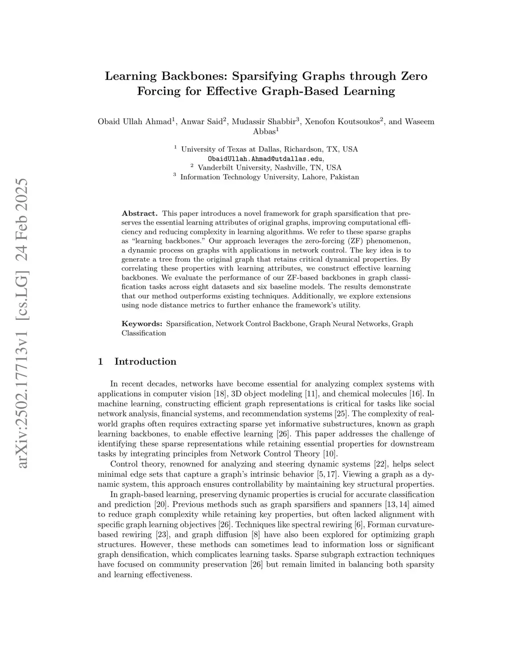 This paper introduces a novel framework for graph sparsification that preserves the essential learning attributes of original graphs, improving computational efficiency and reducing complexity in learning algorithms. We refer to these sparse graphs as "learning backbones". Our approach leverages the zero-forcing (ZF) phenomenon, a dynamic process on graphs with applications in network control. The key idea is to generate a tree from the original graph that retains critical dynamical properties. By correlating these properties with learning attributes, we construct effective learning backbones. We evaluate the performance of our ZF-based backbones in graph classification tasks across eight datasets and six baseline models. The results demonstrate that our method outperforms existing techniques. Additionally, we explore extensions using node distance metrics to further enhance the framework's utility.