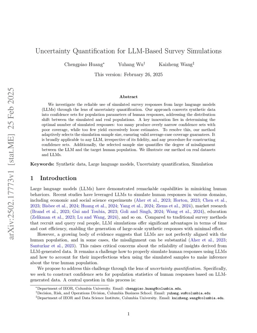 Large language models (LLMs) are increasingly used to simulate survey responses, but synthetic data can be misaligned with the human population, leading to unreliable inference. We develop a general framework that converts LLM-simulated responses into reliable confidence sets for population parameters of human responses, addressing the distribution shift between the simulated and real populations. The key design choice is the number of simulated responses: too many produce overly narrow sets with poor coverage, while too few yield excessively loose estimates. We propose a data-driven approach that adaptively selects the simulation sample size to achieve nominal average-case coverage, regardless of the LLM's simulation fidelity or the confidence set construction procedure. The selected sample size is further shown to reflect the effective human population size that the LLM can represent, providing a quantitative measure of its simulation fidelity. Experiments on real survey datasets reveal heterogeneous fidelity gaps across different LLMs and domains.