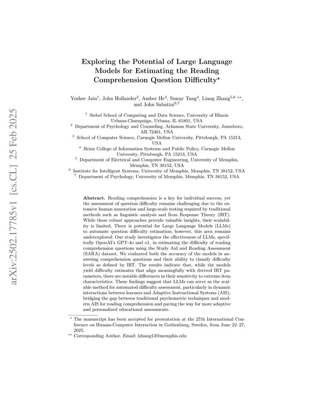 Reading comprehension is a key for individual success, yet the assessment of question difficulty remains challenging due to the extensive human annotation and large-scale testing required by traditional methods such as linguistic analysis and Item Response Theory (IRT). While these robust approaches provide valuable insights, their scalability is limited. There is potential for Large Language Models (LLMs) to automate question difficulty estimation; however, this area remains underexplored. Our study investigates the effectiveness of LLMs, specifically OpenAI's GPT-4o and o1, in estimating the difficulty of reading comprehension questions using the Study Aid and Reading Assessment (SARA) dataset. We evaluated both the accuracy of the models in answering comprehension questions and their ability to classify difficulty levels as defined by IRT. The results indicate that, while the models yield difficulty estimates that align meaningfully with derived IRT parameters, there are notable differences in their sensitivity to extreme item characteristics. These findings suggest that LLMs can serve as the scalable method for automated difficulty assessment, particularly in dynamic interactions between learners and Adaptive Instructional Systems (AIS), bridging the gap between traditional psychometric techniques and modern AIS for reading comprehension and paving the way for more adaptive and personalized educational assessments.