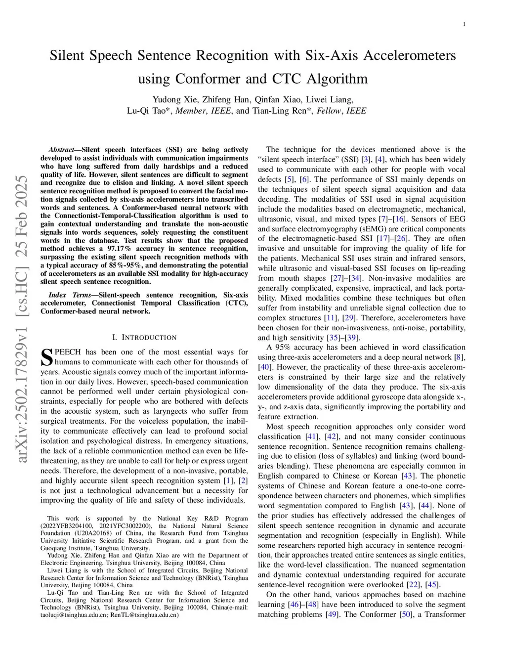 Silent Speech Sentence Recognition with Six-Axis Accelerometers using Conformer and CTC Algorithm