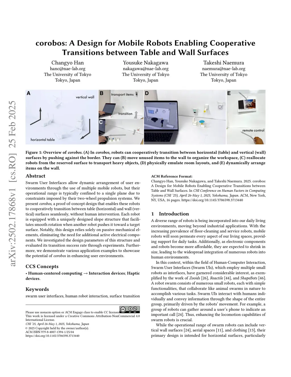 corobos: A Design for Mobile Robots Enabling Cooperative Transitions between Table and Wall Surfaces