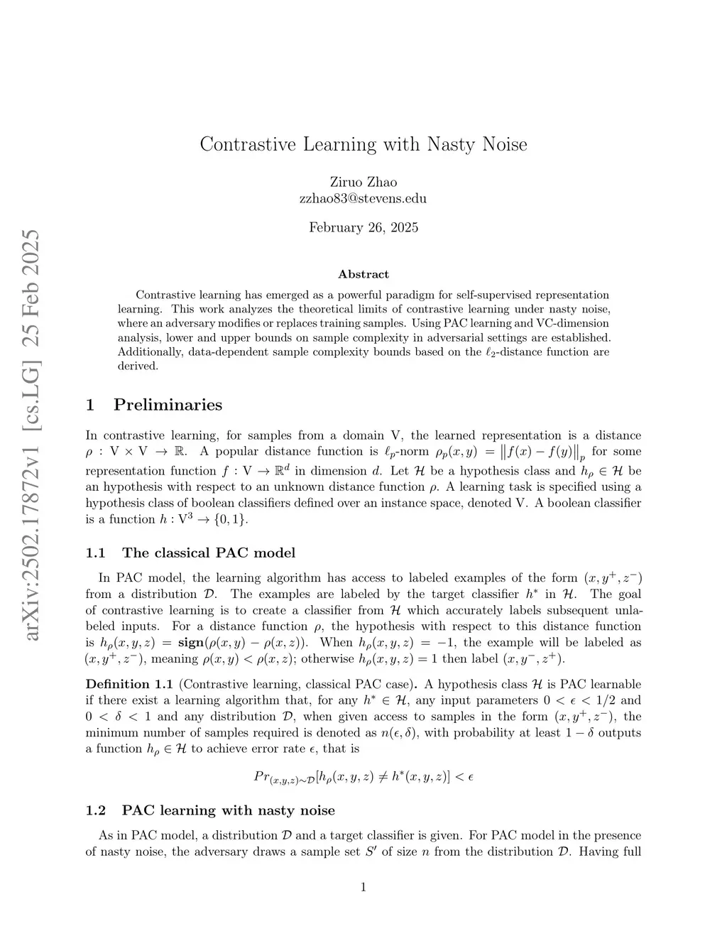 Contrastive learning has emerged as a powerful paradigm for self-supervised representation learning. This work analyzes the theoretical limits of contrastive learning under nasty noise, where an adversary modifies or replaces training samples. Using PAC learning and VC-dimension analysis, lower and upper bounds on sample complexity in adversarial settings are established. Additionally, data-dependent sample complexity bounds based on the l2-distance function are derived.