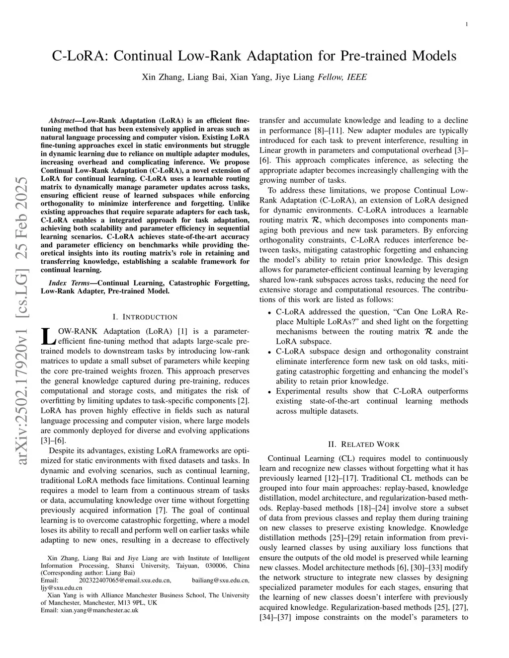 Low-Rank Adaptation (LoRA) is an efficient fine-tuning method that has been extensively applied in areas such as natural language processing and computer vision. Existing LoRA fine-tuning approaches excel in static environments but struggle in dynamic learning due to reliance on multiple adapter modules, increasing overhead and complicating inference. We propose Continual Low-Rank Adaptation (C-LoRA), a novel extension of LoRA for continual learning. C-LoRA uses a learnable routing matrix to dynamically manage parameter updates across tasks, ensuring efficient reuse of learned subspaces while enforcing orthogonality to minimize interference and forgetting. Unlike existing approaches that require separate adapters for each task, C-LoRA enables a integrated approach for task adaptation, achieving both scalability and parameter efficiency in sequential learning scenarios. C-LoRA achieves state-of-the-art accuracy and parameter efficiency on benchmarks while providing theoretical insights into its routing matrix's role in retaining and transferring knowledge, establishing a scalable framework for continual learning.