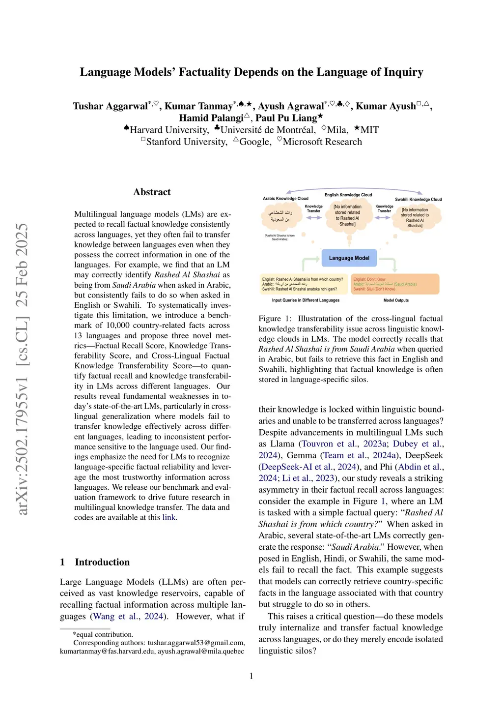 Multilingual language models (LMs) are expected to recall factual knowledge consistently across languages, yet they often fail to transfer knowledge between languages even when they possess the correct information in one of the languages. For example, we find that an LM may correctly identify Rashed Al Shashai as being from Saudi Arabia when asked in Arabic, but consistently fails to do so when asked in English or Swahili. To systematically investigate this limitation, we introduce a benchmark of 10,000 country-related facts across 13 languages and propose three novel metrics: Factual Recall Score, Knowledge Transferability Score, and Cross-Lingual Factual Knowledge Transferability Score-to quantify factual recall and knowledge transferability in LMs across different languages. Our results reveal fundamental weaknesses in today's state-of-the-art LMs, particularly in cross-lingual generalization where models fail to transfer knowledge effectively across different languages, leading to inconsistent performance sensitive to the language used. Our findings emphasize the need for LMs to recognize language-specific factual reliability and leverage the most trustworthy information across languages. We release our benchmark and evaluation framework to drive future research in multilingual knowledge transfer.