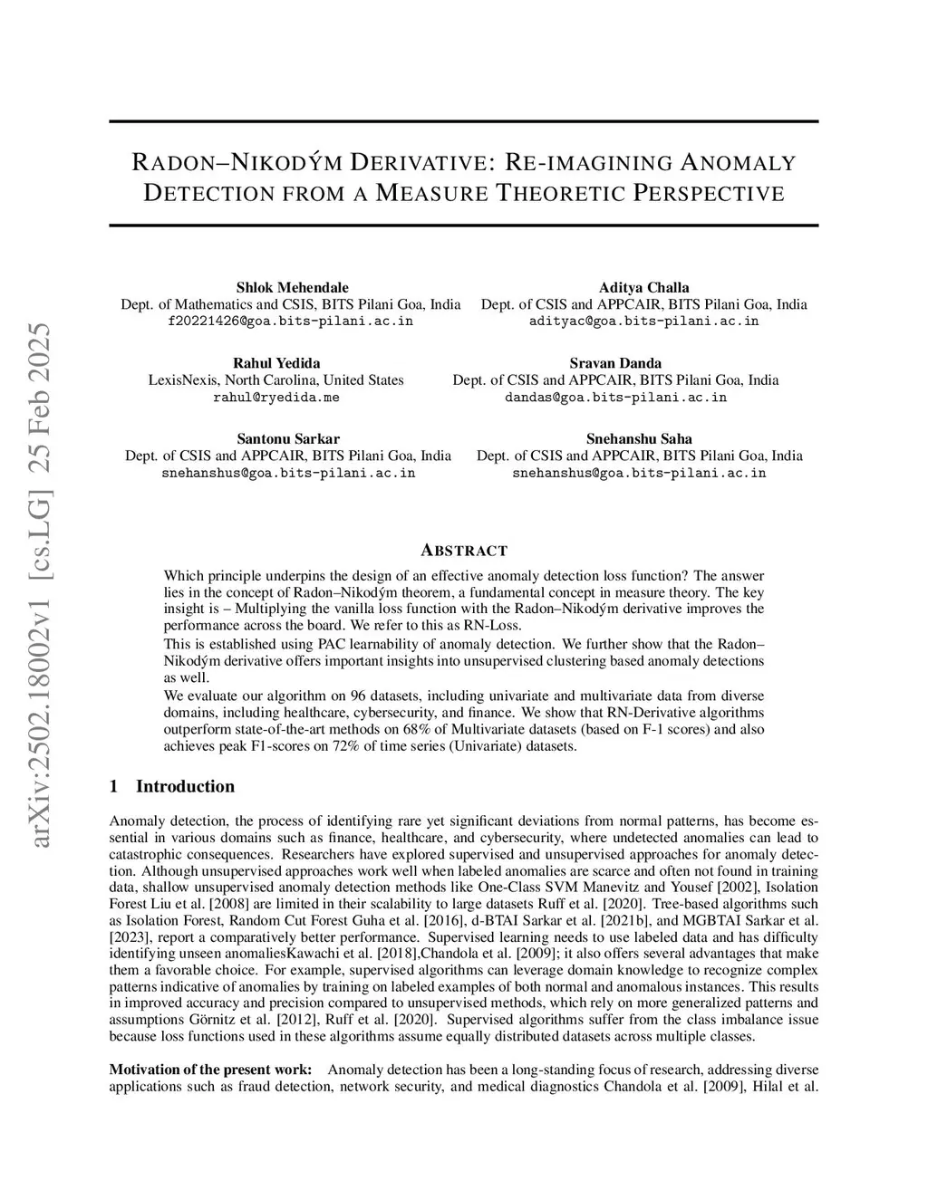 Which principle underpins the design of an effective anomaly detection loss function? The answer lies in the concept of Radon-Nikodým theorem, a fundamental concept in measure theory. The key insight from this article is: Multiplying the vanilla loss function with the Radon-Nikodým derivative improves the performance across the board. We refer to this as RN-Loss. We prove this using the setting of PAC (Probably Approximately Correct) learnability.Depending on the context a Radon-Nikodým derivative takes different forms. In the simplest case of supervised anomaly detection, Radon-Nikodým derivative takes the form of a simple weighted loss. In the case of unsupervised anomaly detection (with distributional assumptions), Radon-Nikodým derivative takes the form of the popular cluster based local outlier factor. We evaluate our algorithm on 96 datasets, including univariate and multivariate data from diverse domains, including healthcare, cybersecurity, and finance. We show that RN-Derivative algorithms outperform state-of-the-art methods on 68% of Multivariate datasets (based on F1 scores) and also achieves peak F1-scores on 72% of time series (Univariate) datasets.