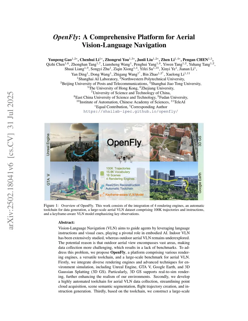 Vision-Language Navigation (VLN) aims to guide agents by leveraging language instructions and visual cues, playing a pivotal role in embodied AI. Indoor VLN has been extensively studied, whereas outdoor aerial VLN remains underexplored. The potential reason is that outdoor aerial view encompasses vast areas, making data collection more challenging, which results in a lack of benchmarks. To address this problem, we propose OpenFly, a platform comprising various rendering engines, a versatile toolchain, and a large-scale benchmark for aerial VLN. Firstly, we integrate diverse rendering engines and advanced techniques for environment simulation, including Unreal Engine, GTA V, Google Earth, and 3D Gaussian Splatting (3D GS). Particularly, 3D GS supports real-to-sim rendering, further enhancing the realism of our environments. Secondly, we develop a highly automated toolchain for aerial VLN data collection, streamlining point cloud acquisition, scene semantic segmentation, flight trajectory creation, and instruction generation. Thirdly, based on the toolchain, we construct a large-scale aerial VLN dataset with 100k trajectories, covering diverse heights and lengths across 18 scenes. Moreover, we propose OpenFly-Agent, a keyframe-aware VLN model emphasizing key observations during flight. For benchmarking, extensive experiments and analyses are conducted, evaluating several recent VLN methods and showcasing the superiority of our OpenFly platform and agent. The toolchain, dataset, and codes will be open-sourced.