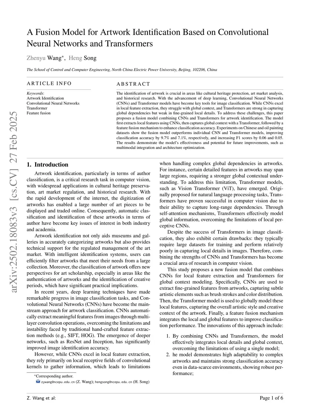 The identification of artwork is crucial in areas like cultural heritage protection, art market analysis, and historical research. With the advancement of deep learning, Convolutional Neural Networks (CNNs) and Transformer models have become key tools for image classification. While CNNs excel in local feature extraction, they struggle with global context, and Transformers are strong in capturing global dependencies but weak in fine-grained local details. To address these challenges, this paper proposes a fusion model combining CNNs and Transformers for artwork identification. The model first extracts local features using CNNs, then captures global context with a Transformer, followed by a feature fusion mechanism to enhance classification accuracy. Experiments on Chinese and oil painting datasets show the fusion model outperforms individual CNN and Transformer models, improving classification accuracy by 9.7% and 7.1%, respectively, and increasing F1 scores by 0.06 and 0.05. The results demonstrate the model's effectiveness and potential for future improvements, such as multimodal integration and architecture optimization.
