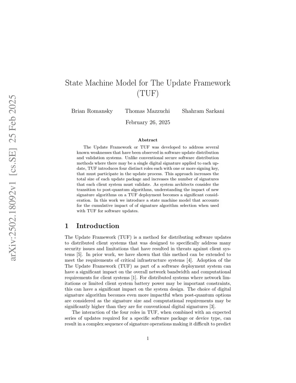 The Update Framework or TUF was developed to address several known weaknesses that have been observed in software update distribution and validation systems. Unlike conventional secure software distribution methods where there may be a single digital signature applied to each update, TUF introduces four distinct roles each with one or more signing key, that must participate in the update process. This approach increases the total size of each update package and increases the number of signatures that each client system must validate. As system architects consider the transition to post-quantum algorithms, understanding the impact of new signature algorithms on a TUF deployment becomes a significant consideration. In this work we introduce a state machine model that accounts for the cumulative impact of of signature algorithm selection when used with TUF for software updates.