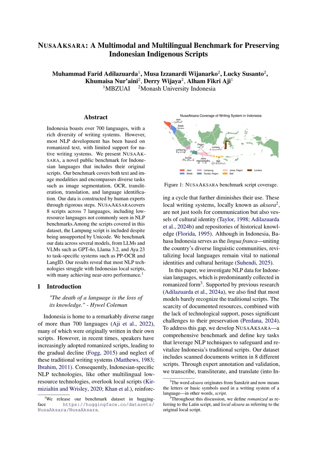 NusaAksara: A Multimodal and Multilingual Benchmark for Preserving Indonesian Indigenous Scripts