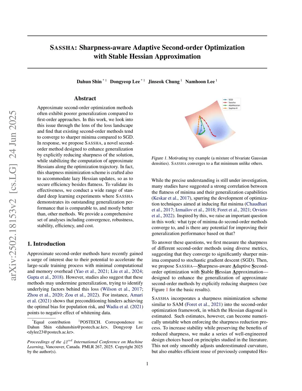 Approximate second-order optimization methods often exhibit poorer generalization compared to first-order approaches. In this work, we look into this issue through the lens of the loss landscape and find that existing second-order methods tend to converge to sharper minima compared to SGD. In response, we propose Sassha, a novel second-order method designed to enhance generalization by explicitly reducing sharpness of the solution, while stabilizing the computation of approximate Hessians along the optimization trajectory. In fact, this sharpness minimization scheme is crafted also to accommodate lazy Hessian updates, so as to secure efficiency besides flatness. To validate its effectiveness, we conduct a wide range of standard deep learning experiments where Sassha demonstrates its outstanding generalization performance that is comparable to, and mostly better than, other methods. We provide a comprehensive set of analyses including convergence, robustness, stability, efficiency, and cost.