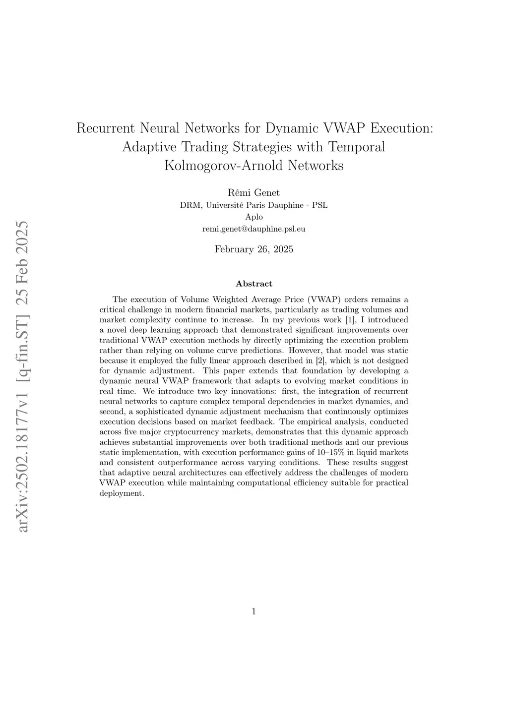 Recurrent Neural Networks for Dynamic VWAP Execution: Adaptive Trading Strategies with Temporal Kolmogorov-Arnold Networks