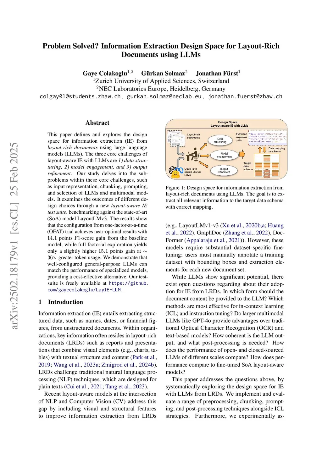 Problem Solved? Information Extraction Design Space for Layout-Rich Documents using LLMs