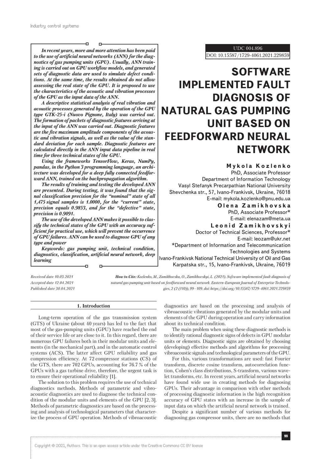 In recent years, more and more attention has been paid to the use of artificial neural networks (ANN) for diagnostics of gas pumping units (GPU). Usually, ANN training is carried out on models of GPU workflows, and generated sets of diagnostic data are used to simulate defect conditions. At the same time, the results obtained do not allow assessing the real state of the GPU. It is proposed to use the values of the characteristics of the acoustic and vibration processes of the GPU as the input data of the ANN. A descriptive statistical analysis of real vibration and acoustic processes generated by the operation of the GPU type GTK-25-i (Nuovo Pignone, Italy) has been carried out. The formation of packets of diagnostic signs arriving at the input of the ANN has been carried out. The diagnostic features are the five maximum amplitude components of the acoustic and vibration signals, as well as the value of the standard deviation for each sample. Diagnostic signs are calculated directly in the input pipeline of ANN data in real time for three technical states of the GPU. Using the frameworks TensorFlow, Keras, NumPy, pandas, in the Python 3 programming language, an architecture was developed for a deep fully connected feedforward ANN, training on the error backpropagation algorithm. The results of training and testing of the developed ANN are presented. During testing, it was found that the signal classification precision for the "nominal" state of all 1475 signal samples is 1.0000, for the "current" state, precision equils 0.9853, and for the "defective" state, precision is 0.9091. The use of the developed ANN makes it possible to classify the technical states of the GPU with an accuracy sufficient for practical use, which will prevent the occurrence of GPU failures. ANN can be used to diagnose GPU of any type and power.