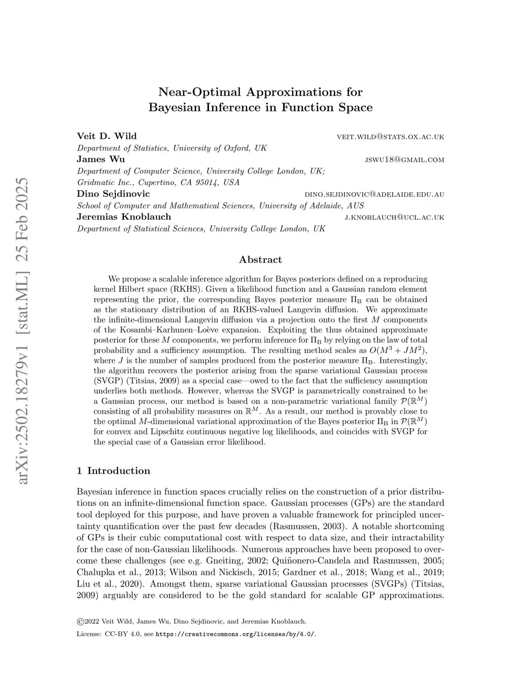 We propose a scalable inference algorithm for Bayes posteriors defined on a reproducing kernel Hilbert space (RKHS). Given a likelihood function and a Gaussian random element representing the prior, the corresponding Bayes posterior measure can be obtained as the stationary distribution of an RKHS-valued Langevin diffusion. We approximate the infinite-dimensional Langevin diffusion via a projection onto the first components of the Kosambi-Karhunen-Loève expansion. Exploiting the thus obtained approximate posterior for these components, we perform inference for by relying on the law of total probability and a sufficiency assumption. The resulting method scales as , where is the number of samples produced from the posterior measure . Interestingly, the algorithm recovers the posterior arising from the sparse variational Gaussian process (SVGP) (see Titsias, 2009) as a special case, owed to the fact that the sufficiency assumption underlies both methods. However, whereas the SVGP is parametrically constrained to be a Gaussian process, our method is based on a non-parametric variational family consisting of all probability measures on . As a result, our method is provably close to the optimal -dimensional variational approximation of the Bayes posterior in for convex and Lipschitz continuous negative log likelihoods, and coincides with SVGP for the special case of a Gaussian error likelihood.