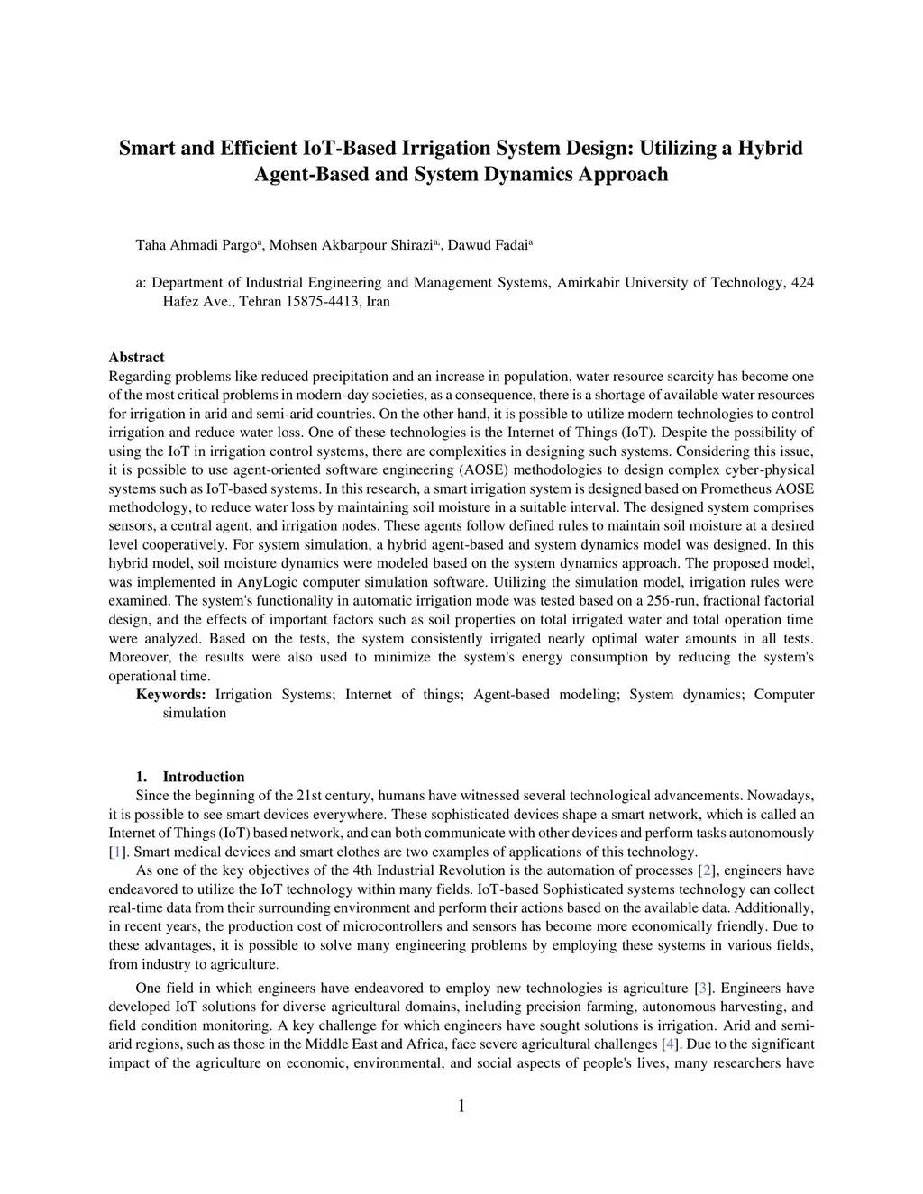 Regarding problems like reduced precipitation and an increase in population, water resource scarcity has become one of the most critical problems in modern-day societies, as a consequence, there is a shortage of available water resources for irrigation in arid and semi-arid countries. On the other hand, it is possible to utilize modern technologies to control irrigation and reduce water loss. One of these technologies is the Internet of Things (IoT). Despite the possibility of using the IoT in irrigation control systems, there are complexities in designing such systems. Considering this issue, it is possible to use agent-oriented software engineering (AOSE) methodologies to design complex cyber-physical systems such as IoT-based systems. In this research, a smart irrigation system is designed based on Prometheus AOSE methodology, to reduce water loss by maintaining soil moisture in a suitable interval. The designed system comprises sensors, a central agent, and irrigation nodes. These agents follow defined rules to maintain soil moisture at a desired level cooperatively. For system simulation, a hybrid agent-based and system dynamics model was designed. In this hybrid model, soil moisture dynamics were modeled based on the system dynamics approach. The proposed model, was implemented in AnyLogic computer simulation software. Utilizing the simulation model, irrigation rules were examined. The system's functionality in automatic irrigation mode was tested based on a 256-run, fractional factorial design, and the effects of important factors such as soil properties on total irrigated water and total operation time were analyzed. Based on the tests, the system consistently irrigated nearly optimal water amounts in all tests. Moreover, the results were also used to minimize the system's energy consumption by reducing the system's operational time.