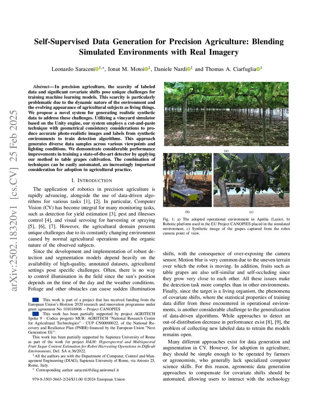 In precision agriculture, the scarcity of labeled data and significant covariate shifts pose unique challenges for training machine learning models. This scarcity is particularly problematic due to the dynamic nature of the environment and the evolving appearance of agricultural subjects as living things. We propose a novel system for generating realistic synthetic data to address these challenges. Utilizing a vineyard simulator based on the Unity engine, our system employs a cut-and-paste technique with geometrical consistency considerations to produce accurate photo-realistic images and labels from synthetic environments to train detection algorithms. This approach generates diverse data samples across various viewpoints and lighting conditions. We demonstrate considerable performance improvements in training a state-of-the-art detector by applying our method to table grapes cultivation. The combination of techniques can be easily automated, an increasingly important consideration for adoption in agricultural practice.