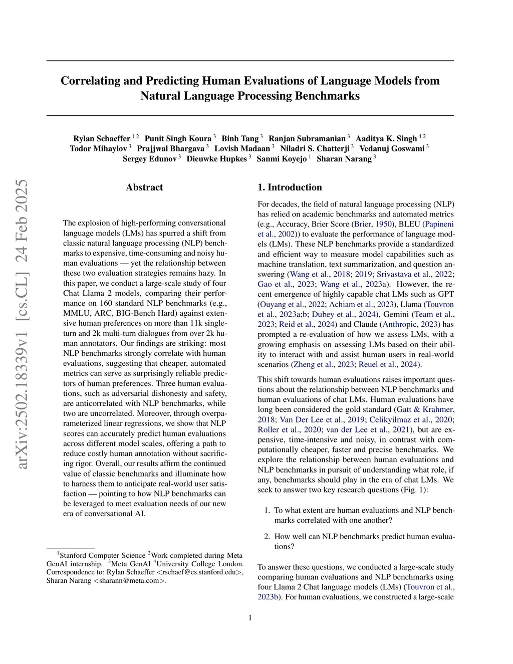 The explosion of high-performing conversational language models (LMs) has spurred a shift from classic natural language processing (NLP) benchmarks to expensive, time-consuming and noisy human evaluations - yet the relationship between these two evaluation strategies remains hazy. In this paper, we conduct a large-scale study of four Chat Llama 2 models, comparing their performance on 160 standard NLP benchmarks (e.g., MMLU, ARC, BIG-Bench Hard) against extensive human preferences on more than 11k single-turn and 2k multi-turn dialogues from over 2k human annotators. Our findings are striking: most NLP benchmarks strongly correlate with human evaluations, suggesting that cheaper, automated metrics can serve as surprisingly reliable predictors of human preferences. Three human evaluations, such as adversarial dishonesty and safety, are anticorrelated with NLP benchmarks, while two are uncorrelated. Moreover, through overparameterized linear regressions, we show that NLP scores can accurately predict human evaluations across different model scales, offering a path to reduce costly human annotation without sacrificing rigor. Overall, our results affirm the continued value of classic benchmarks and illuminate how to harness them to anticipate real-world user satisfaction - pointing to how NLP benchmarks can be leveraged to meet evaluation needs of our new era of conversational AI.