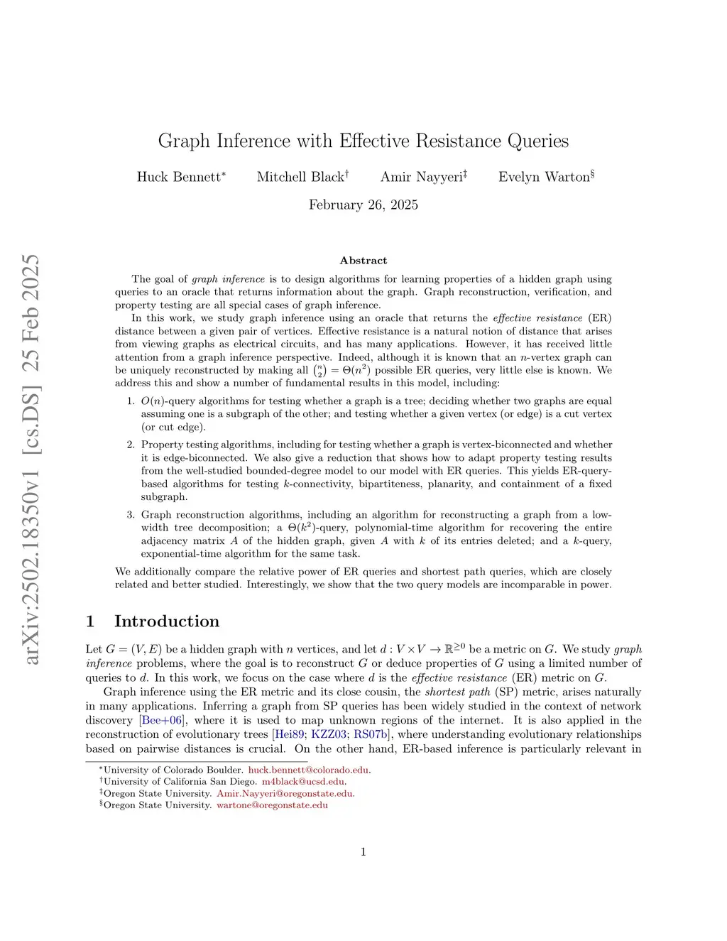 The goal of graph inference is to design algorithms for learning properties of a hidden graph using queries to an oracle that returns information about the graph. Graph reconstruction, verification, and property testing are all types of graph inference.In this work, we study graph inference using an oracle that returns the effective resistance (ER) between a pair of vertices. Effective resistance is a distance originating from the study of electrical circuits with many applications. However, ER has received little attention from a graph inference perspective. Indeed, although it is known that an -vertex graph can be uniquely reconstructed from all possible ER queries, little else is known. We address this gap with several new results, including:1. -query algorithms for testing whether a graph is a tree; deciding whether two graphs are equal assuming one is a subgraph of the other; and testing whether a given vertex (or edge) is a cut vertex (or cut edge).2. Property testing algorithms, including for testing whether a graph is vertex- or edge-biconnected. We also give a reduction to adapt property testing results from the bounded-degree model to our ER query model. This yields ER-query-based algorithms for testing -connectivity, bipartiteness, planarity, and containment of a fixed subgraph.3. Graph reconstruction algorithms, including an algorithm for reconstructing a graph from a low-width tree decomposition; a -query, polynomial-time algorithm for recovering the adjacency matrix of a hidden graph, given with of its entries deleted; and a -query, exponential-time algorithm for the same task.We also compare the power of ER queries and shortest path queries, which are closely related but better studied. Interestingly, we show that the two query models are incomparable in power.